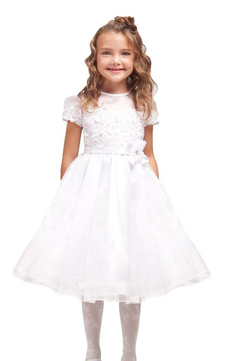 Short-sleeved A-line Dress With Lace and Flower