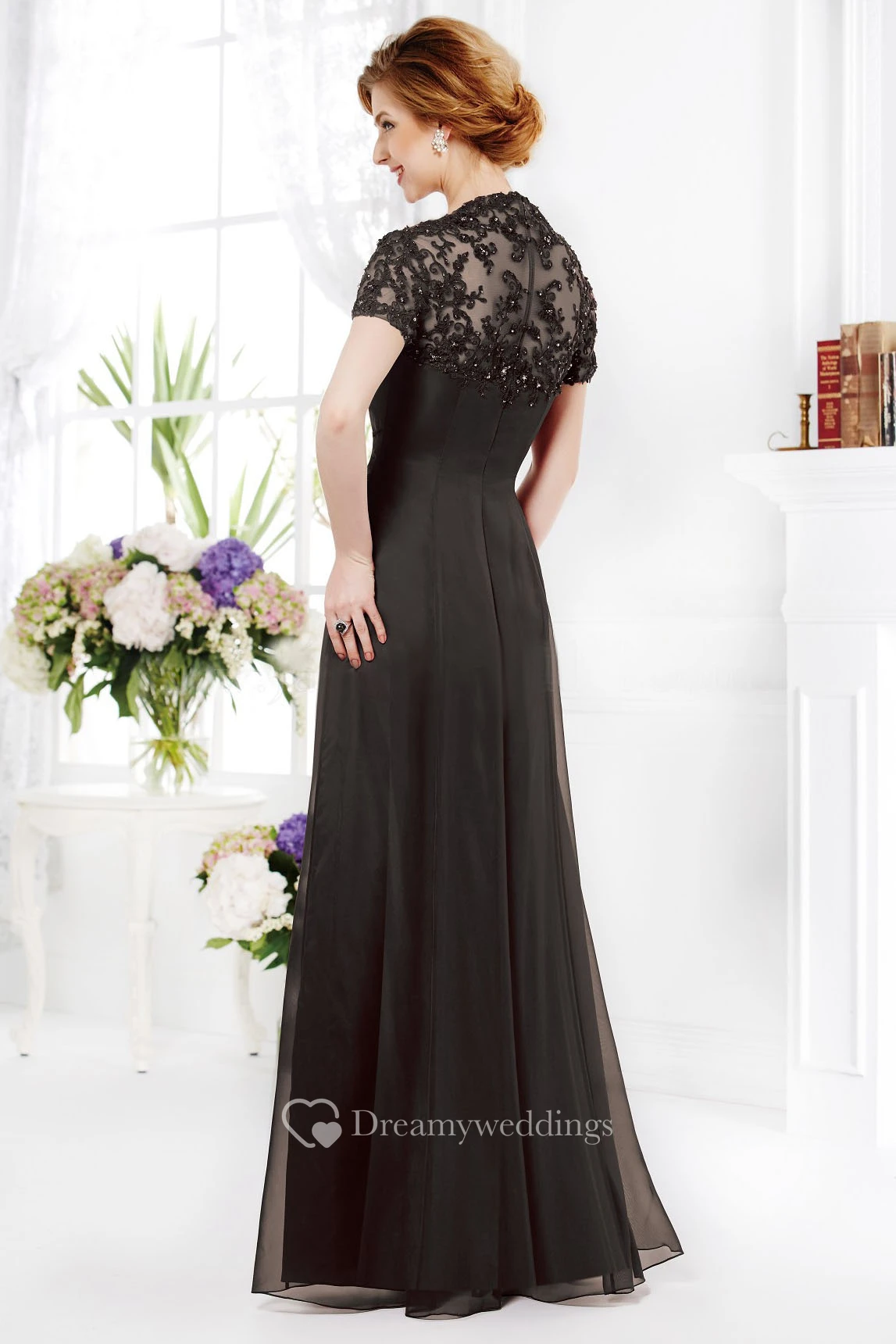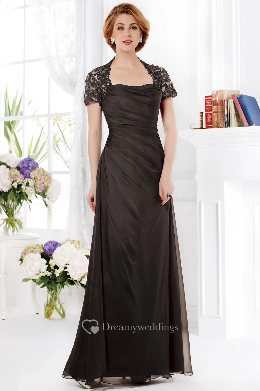Short-Sleeved A-Line Mother Of The Bride Dress With Ruches And Square Neck
