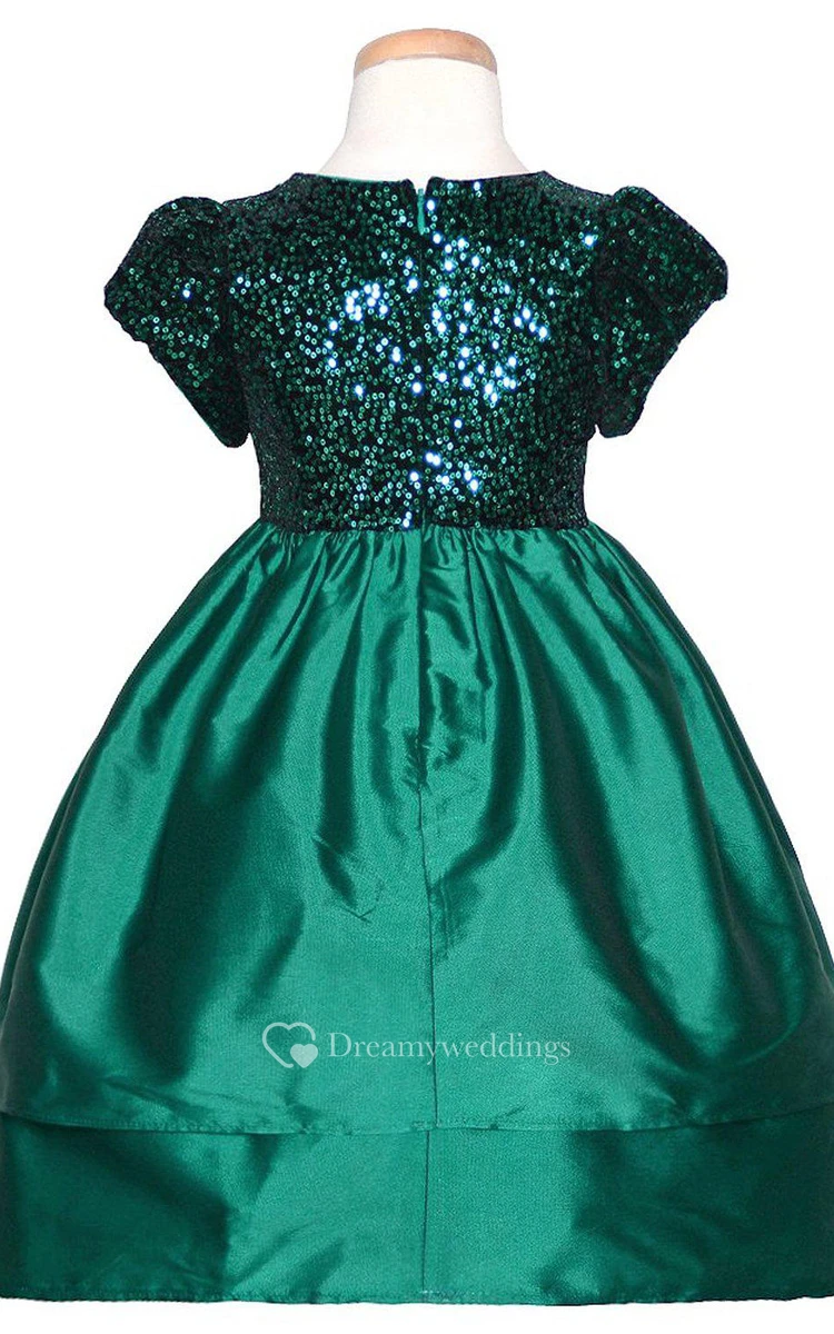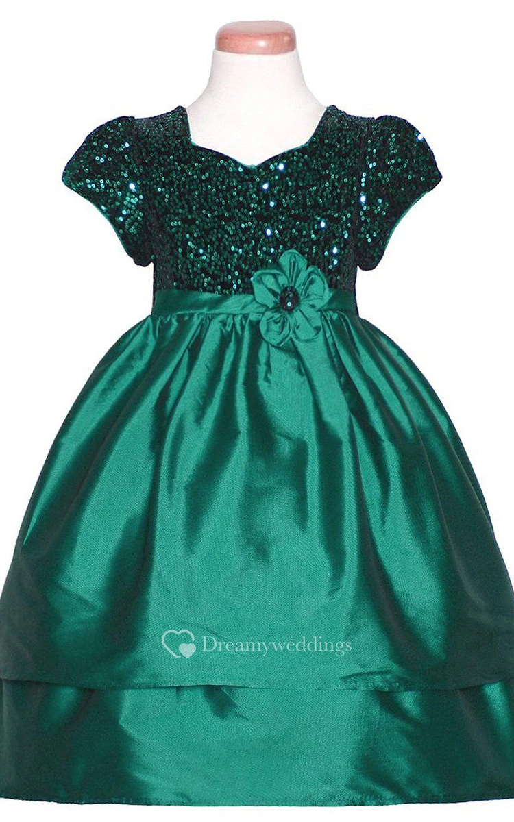 Short-sleeved A-line Sequined Dress With Flower and Pleats