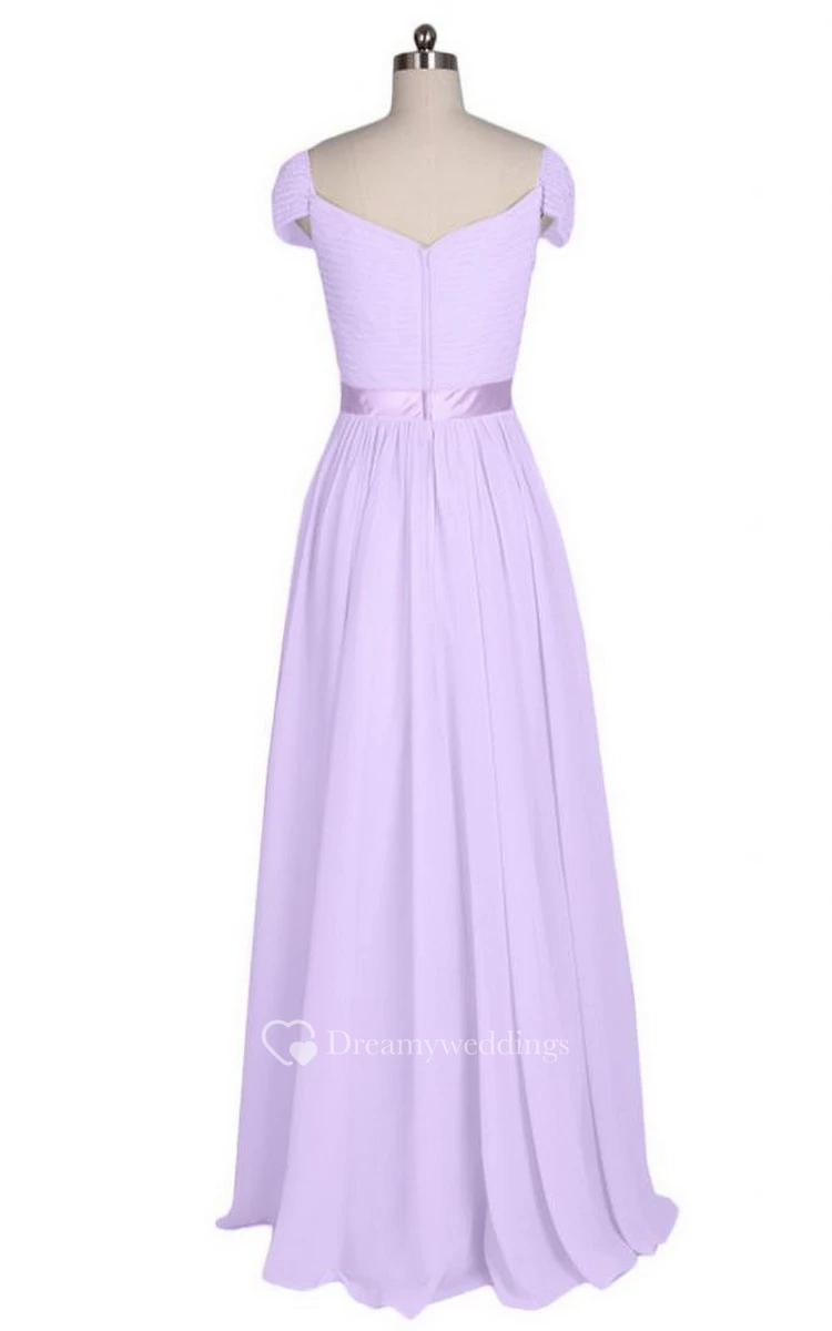 Short-sleeved Long Chiffon Dress With Pleats and Sash