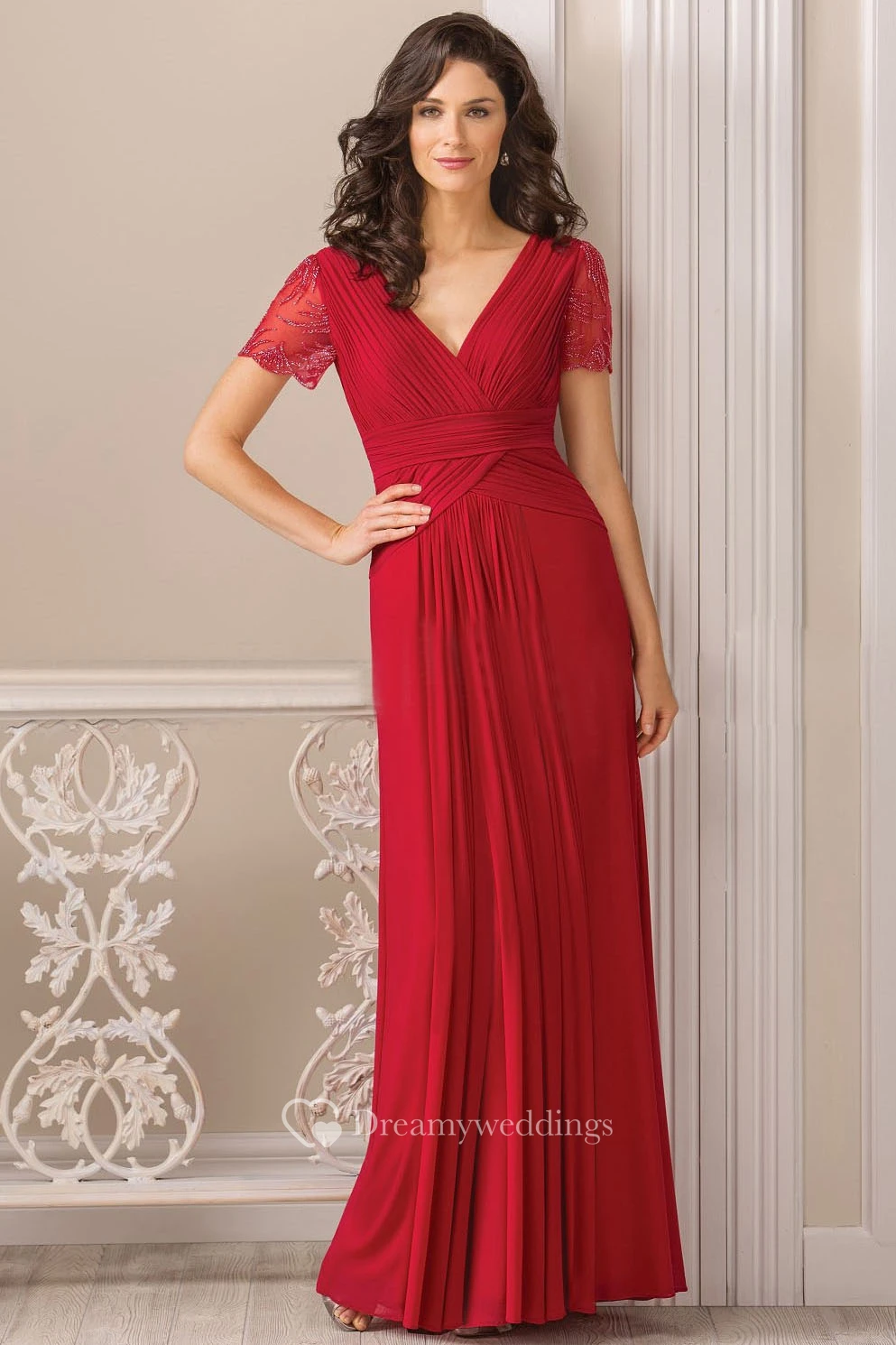 Short-Sleeved V-Neck Long Mother Of The Bride Dress With Pleats And Beadings