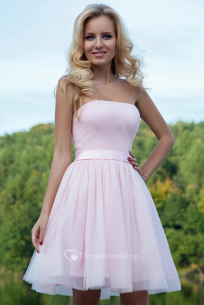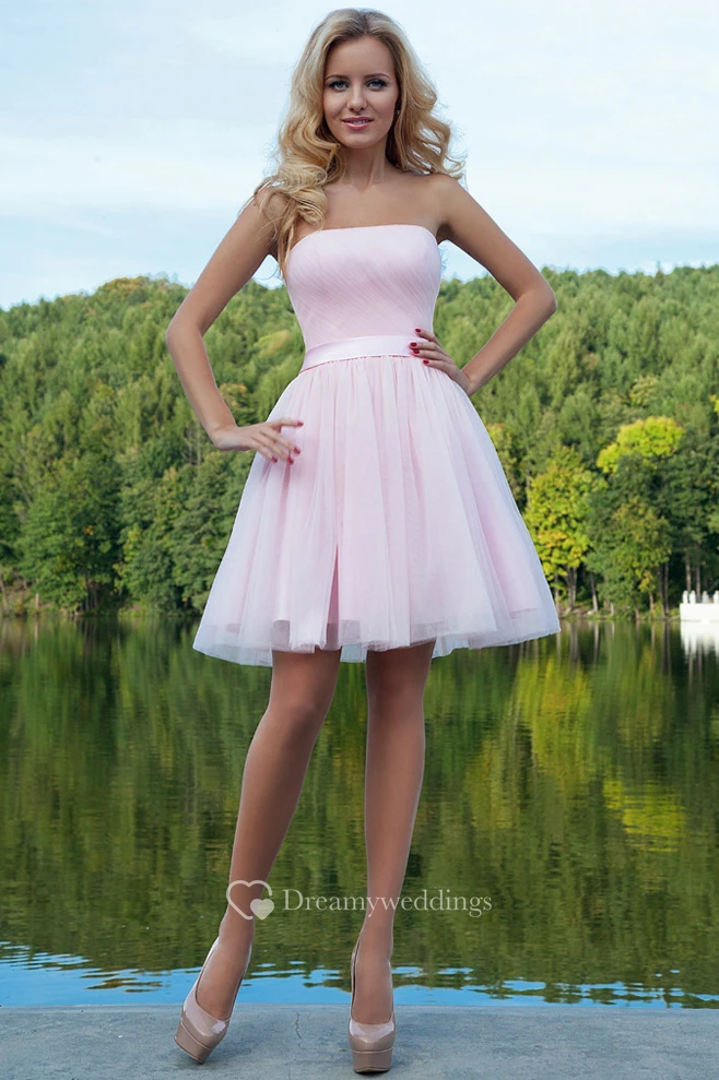 Short Strapless Ruched Tulle Prom Dress With Ribbon