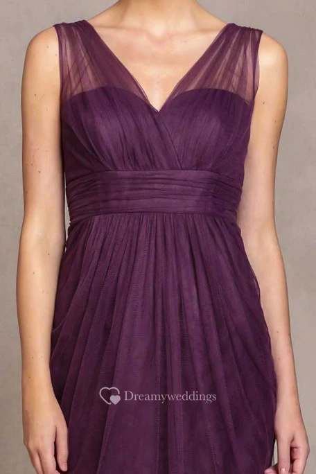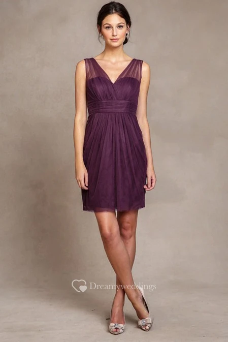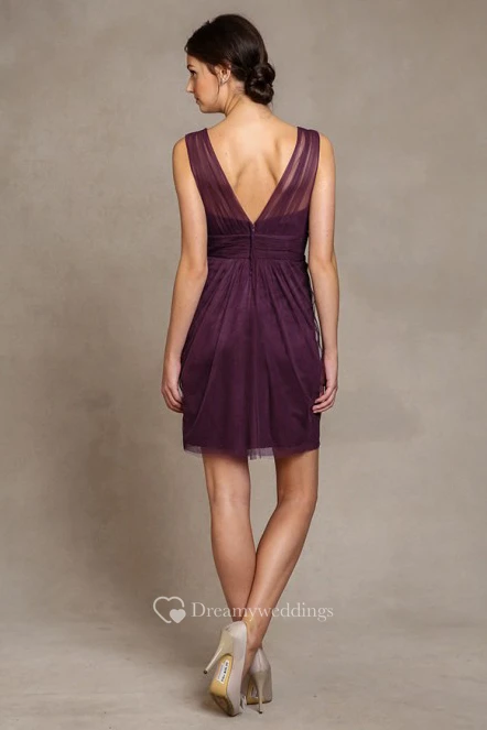 Short V-Neck Sleeveless Tulle Bridesmaid Dress With Ruching And V Back