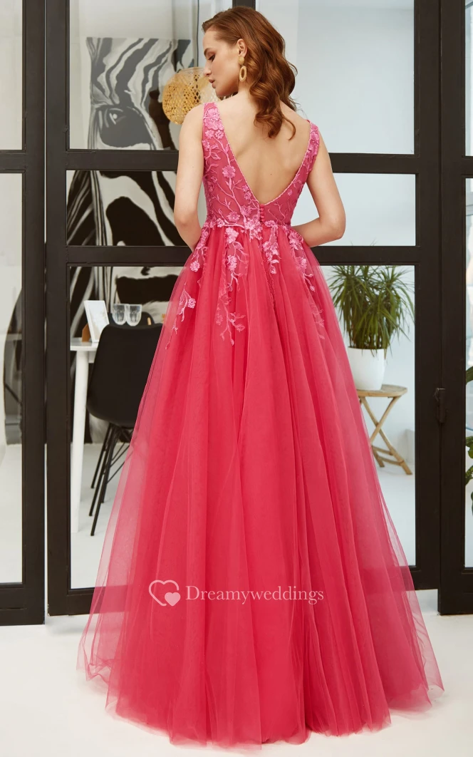 Simple A Line Lace V-neck Floor-length Open Back Evening Dress with Appliques
