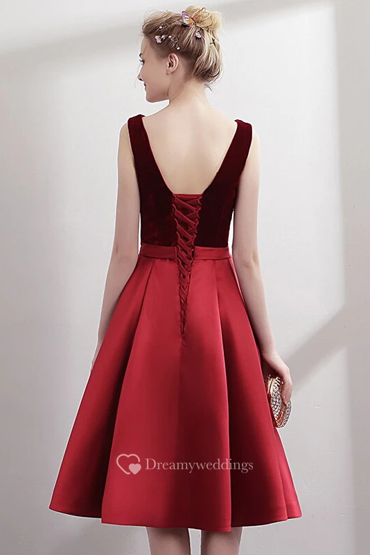 Simple A-line Satin V-Neck Sleeveless Knee Length Dress with Corset Back