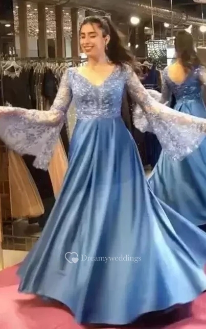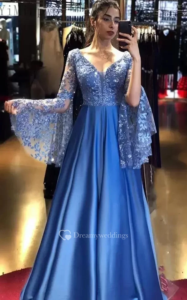 Simple A Line V-neck Floor-length Long Sleeve Satin Prom Dress with Appliques
