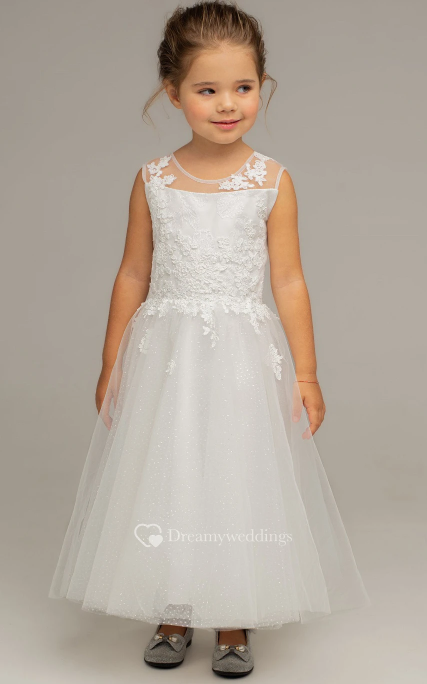 Simple Bateau A Line Tulle Ankle-length Sleeveless Flowergirl Dress with Ruching