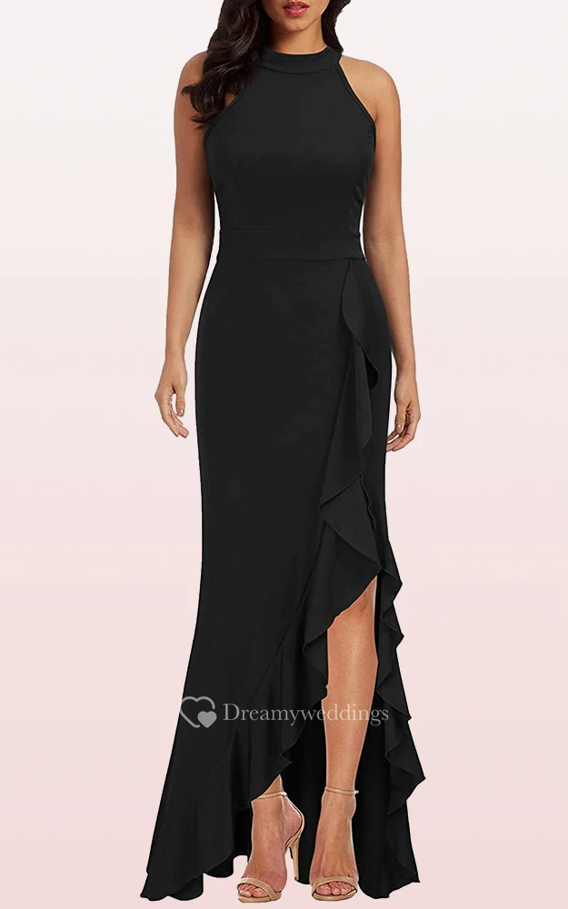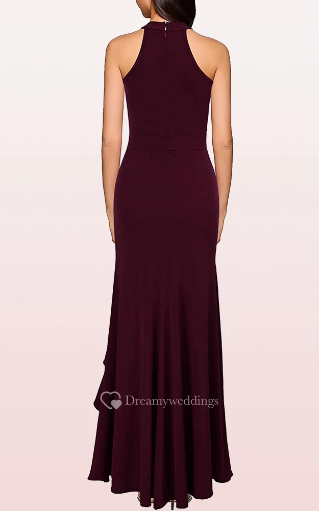 Simple Jersey Sleeveless Halter Sheath Evening Dress With Ruffles and Split Front