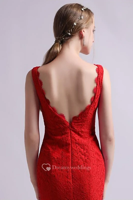 Simple Lace Mermaid Sleeveless High-Low Dress with Zippered Deep-V Back