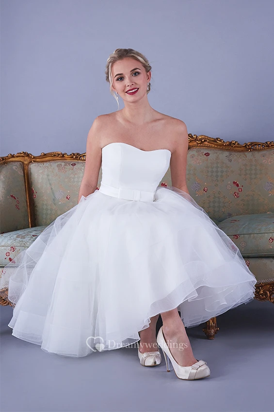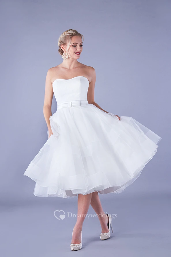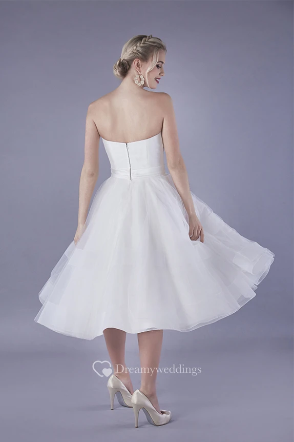 Simple Organza Aline Strapless Knee-length Bridal Gown with Ruching