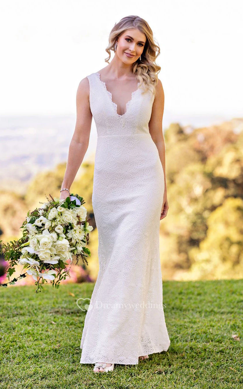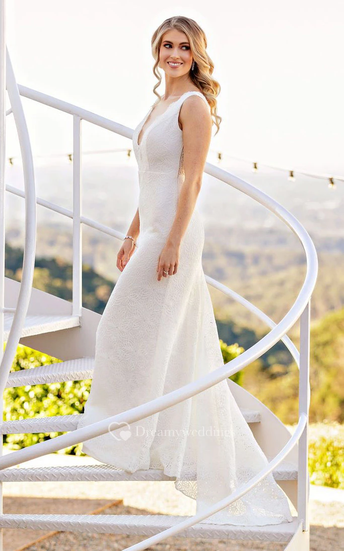 Simple Sheath Scalloped Lace Floor-length Sleeveless Low-V Back Deep-V Back Wedding Dress