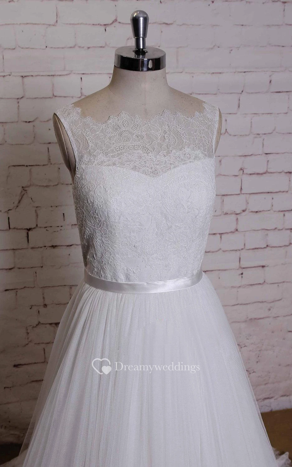 Sleeveless A-Line Dress With Lace Bodice and Satin Sash