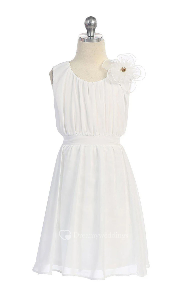 Sleeveless A-line Jersey Dress With Flower and Pleats