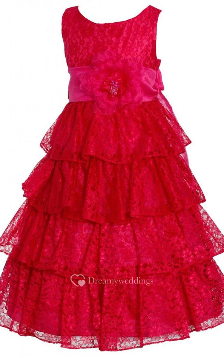 Sleeveless A-line Lace Dress With Tiers and Flower and Bow