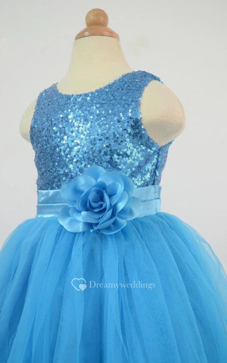 Sleeveless A-line Sequined Dress With Flower and Pleats