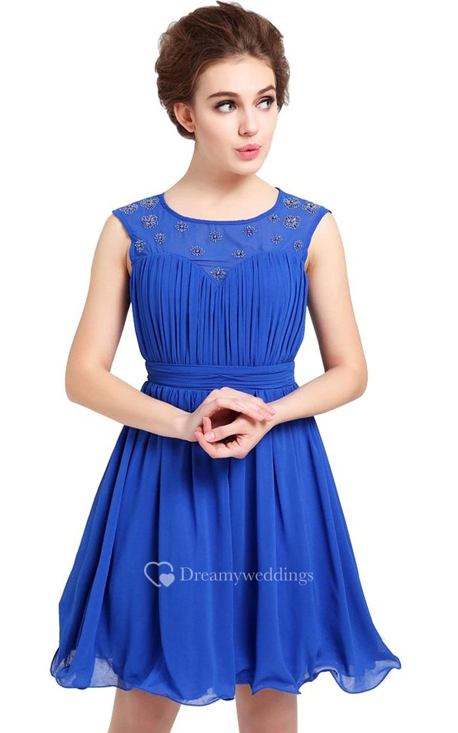 Sleeveless Appliqued Pleated Bodice Short Ruffled Chiffon Dress
