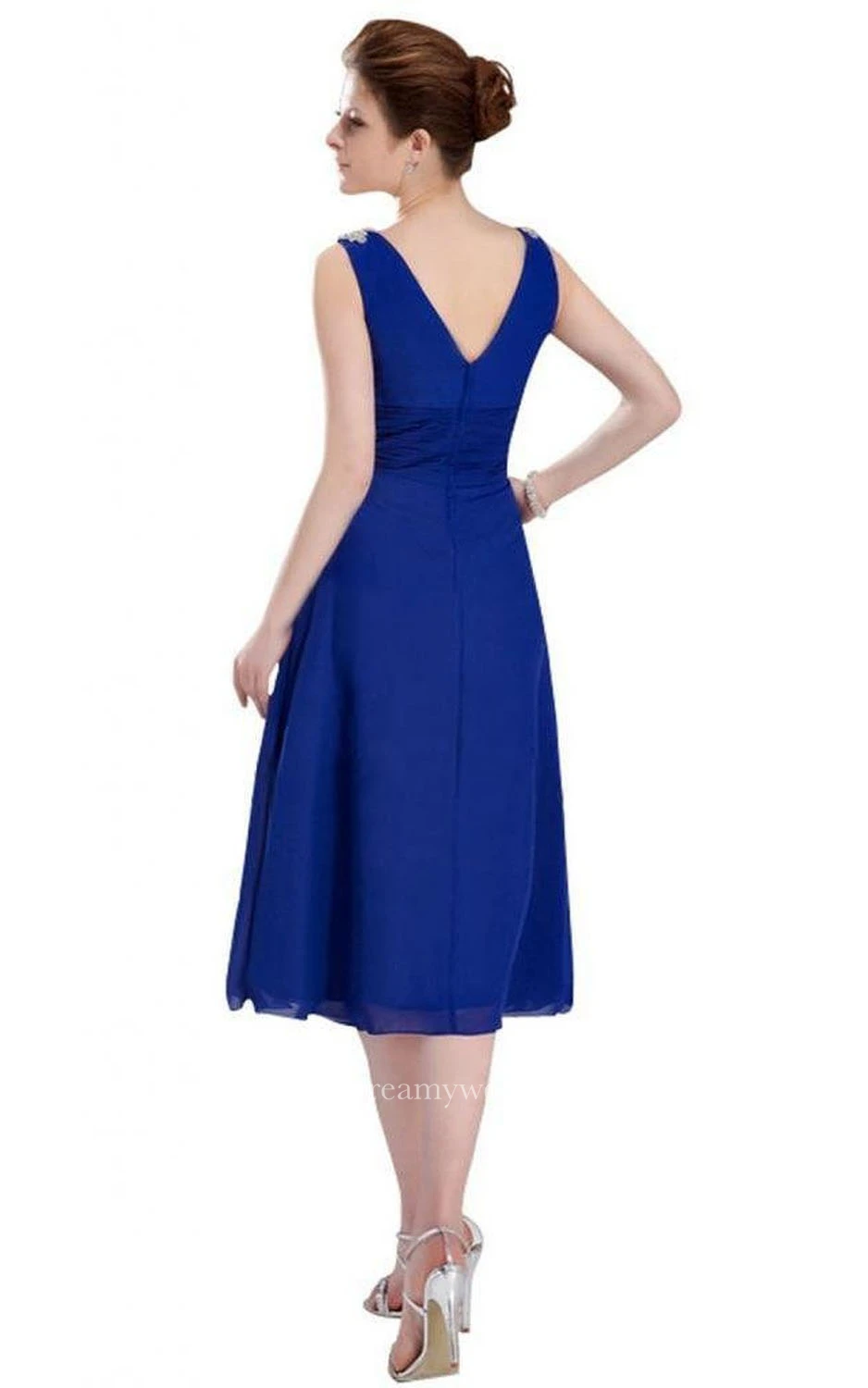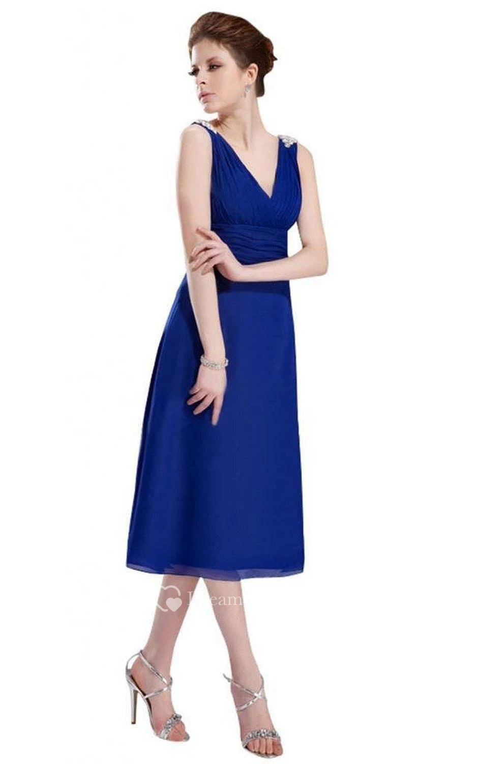Sleeveless Beaded V-neck Ruched Bodice Midi-length Chiffon Dress