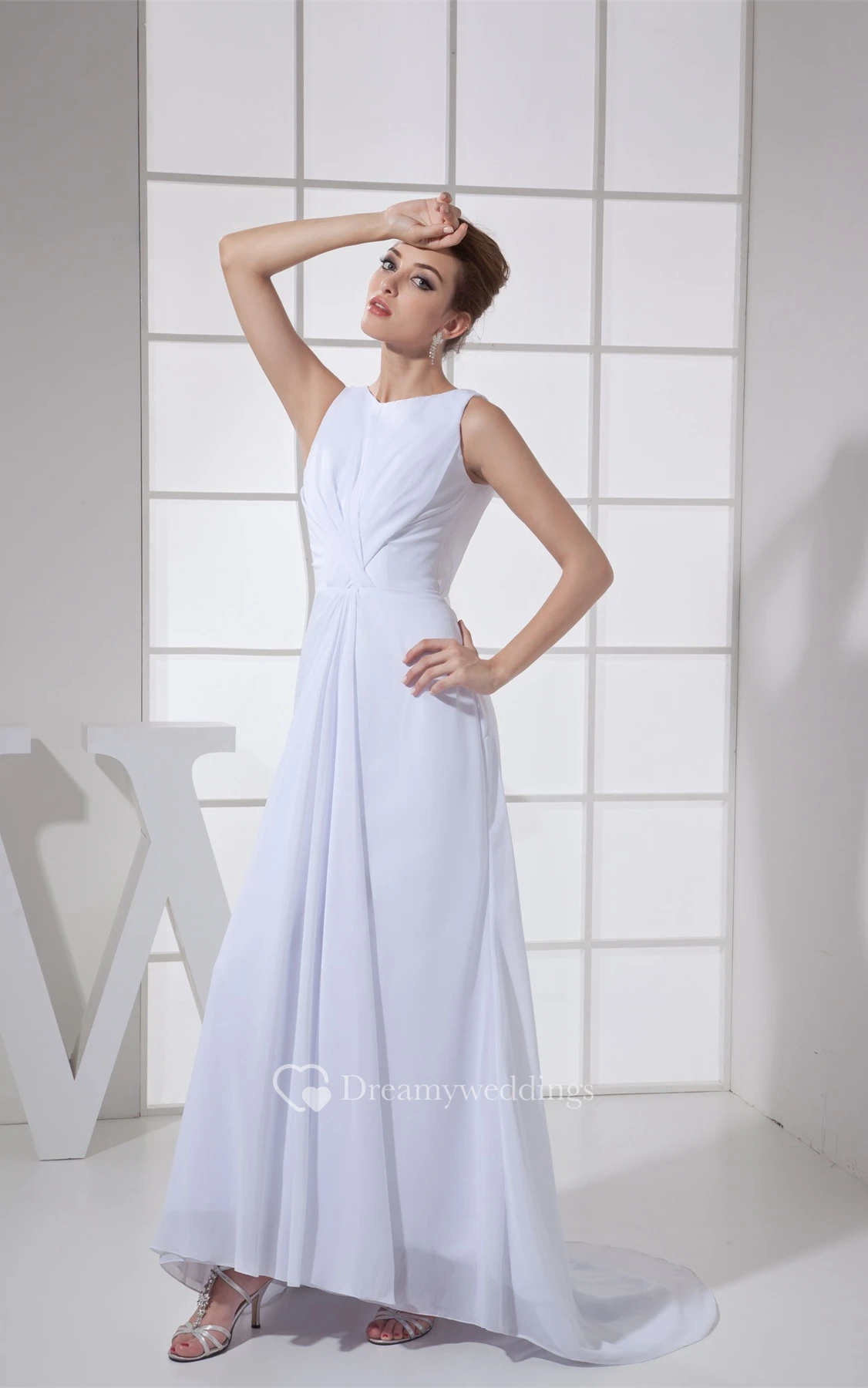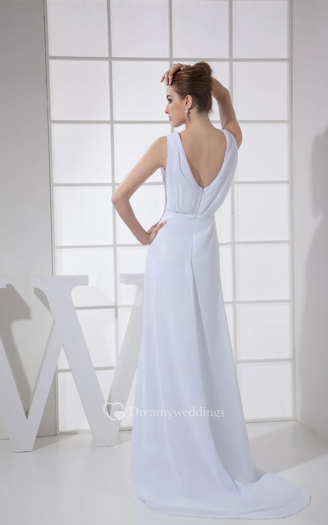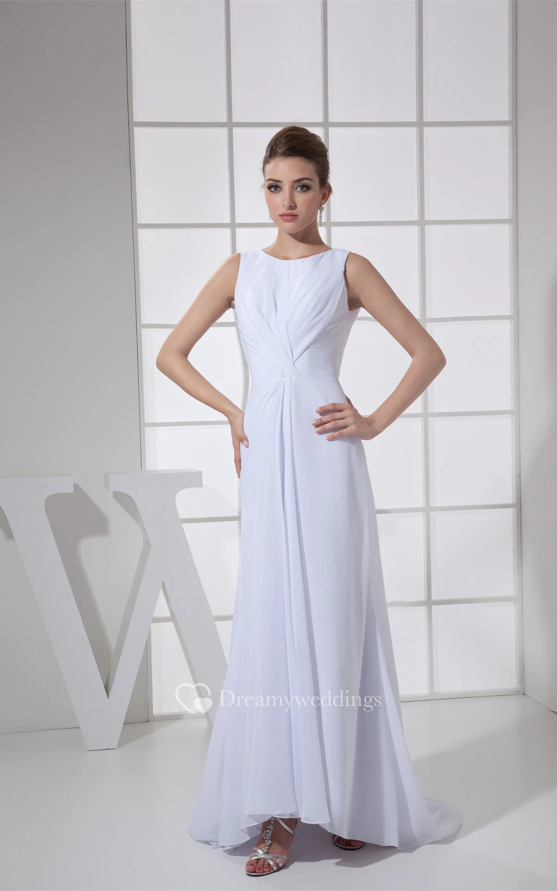 Sleeveless Chiffon Floor-Length Central-Ruched Dress With Low-V Back