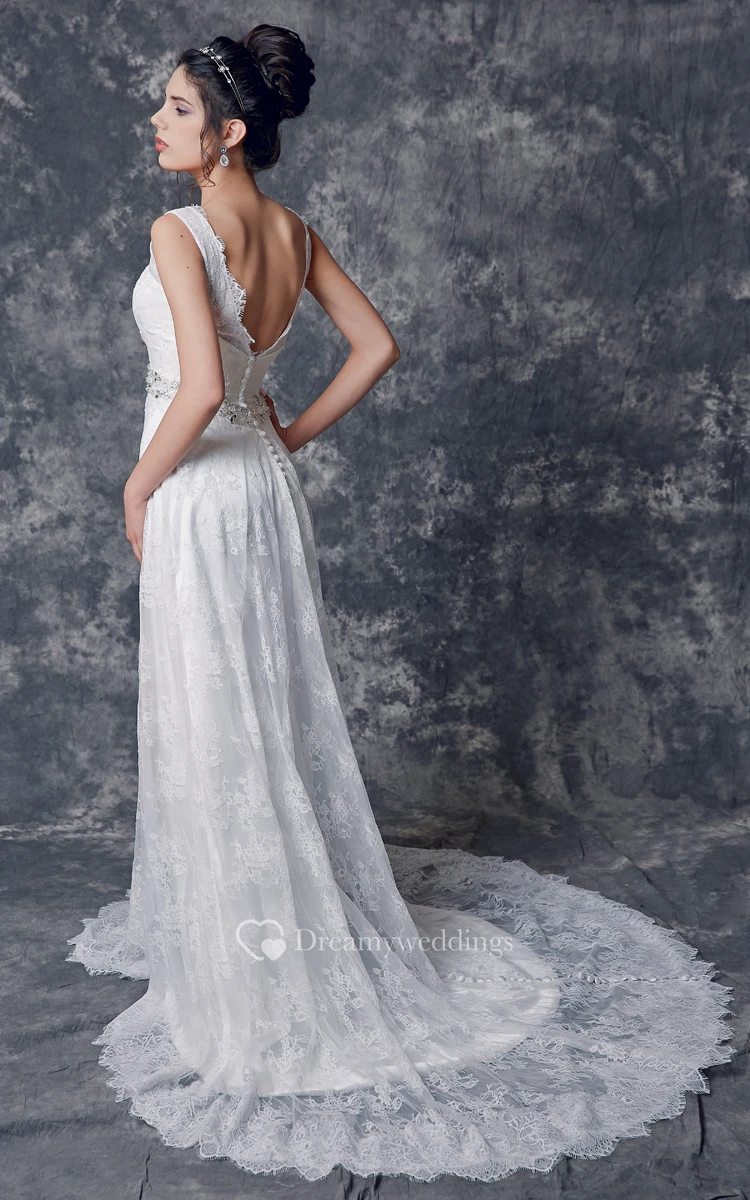 This floral lacy gown flows full length to the floor. With a pooling court train, edged with a delicate scallop, this dress has a loose flowing skirt line. The V-shaped neckline tapers over the shoulders as straps, finishing with a low cut backline. A wide fitted beaded band sits around the waistline. To the back a long row of decorative buttons runs from top to bottom.