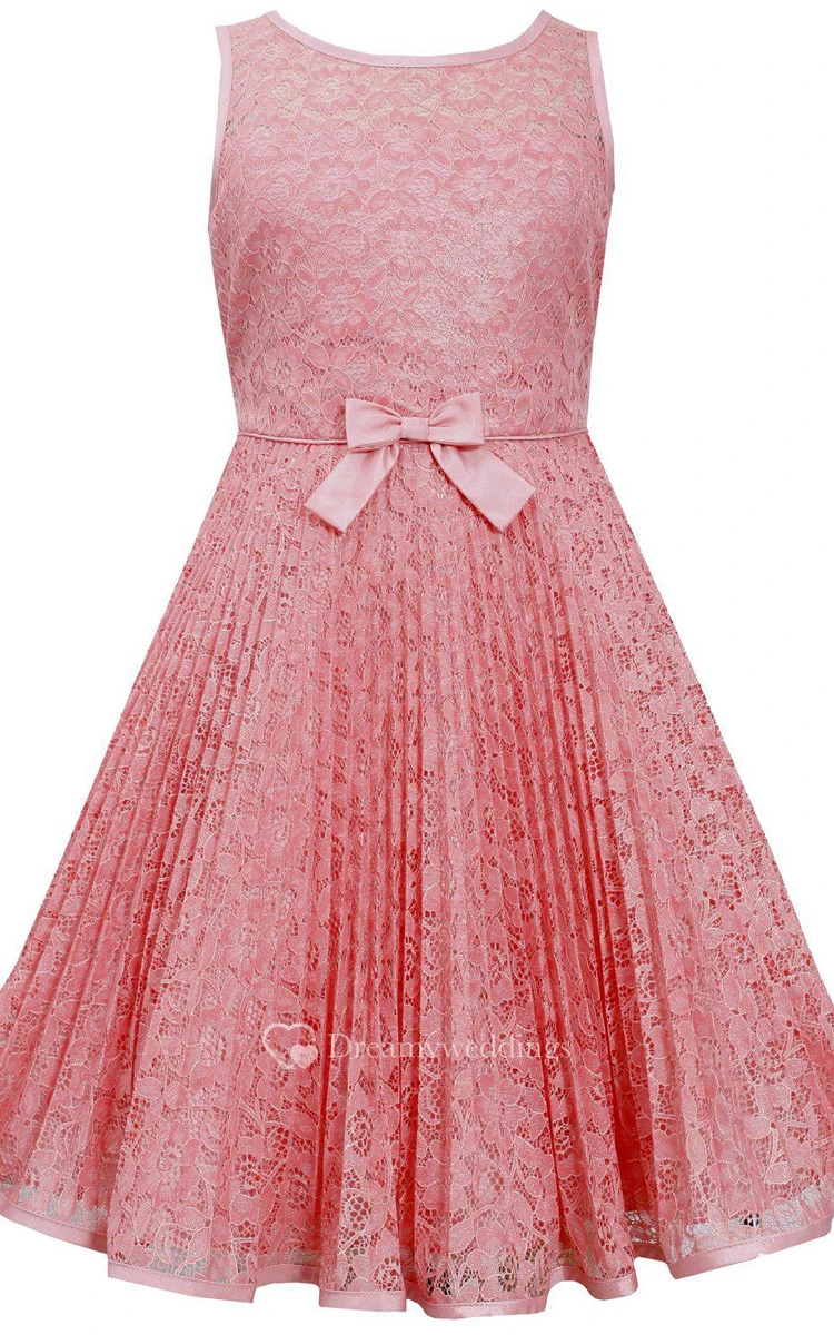 Sleeveless Lace Dress With Bow and Pleats