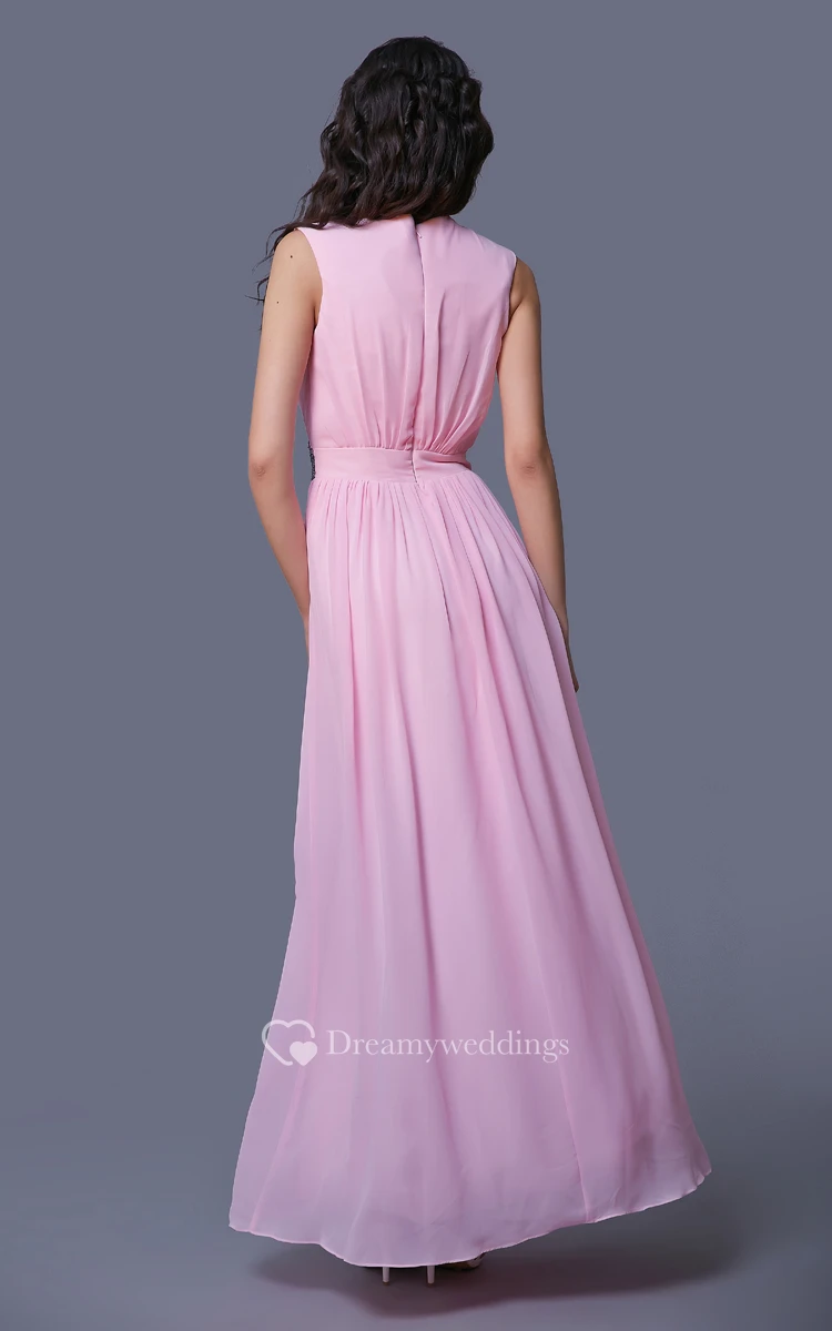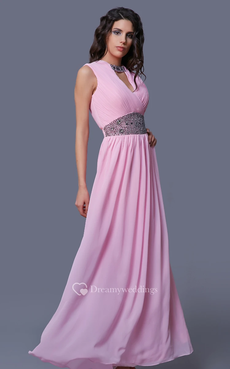 Sleeveless Long Chiffon Dress With Crystal Detailing and Ruching
