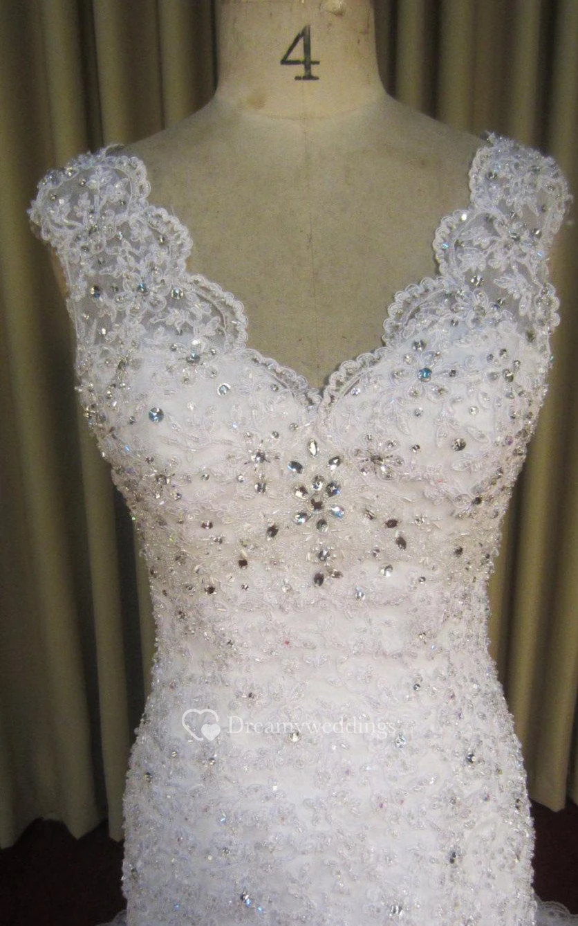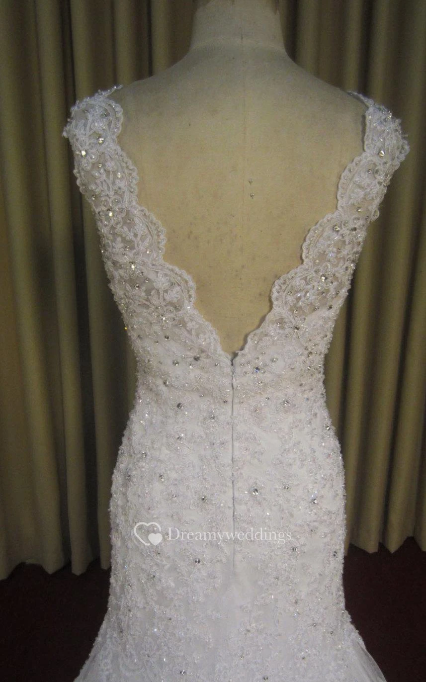 Sleeveless Mermaid Lace Dress With Scalloped V-Neck and Rhinestones