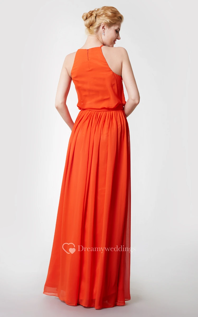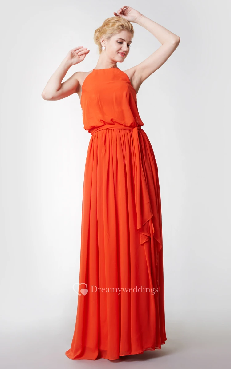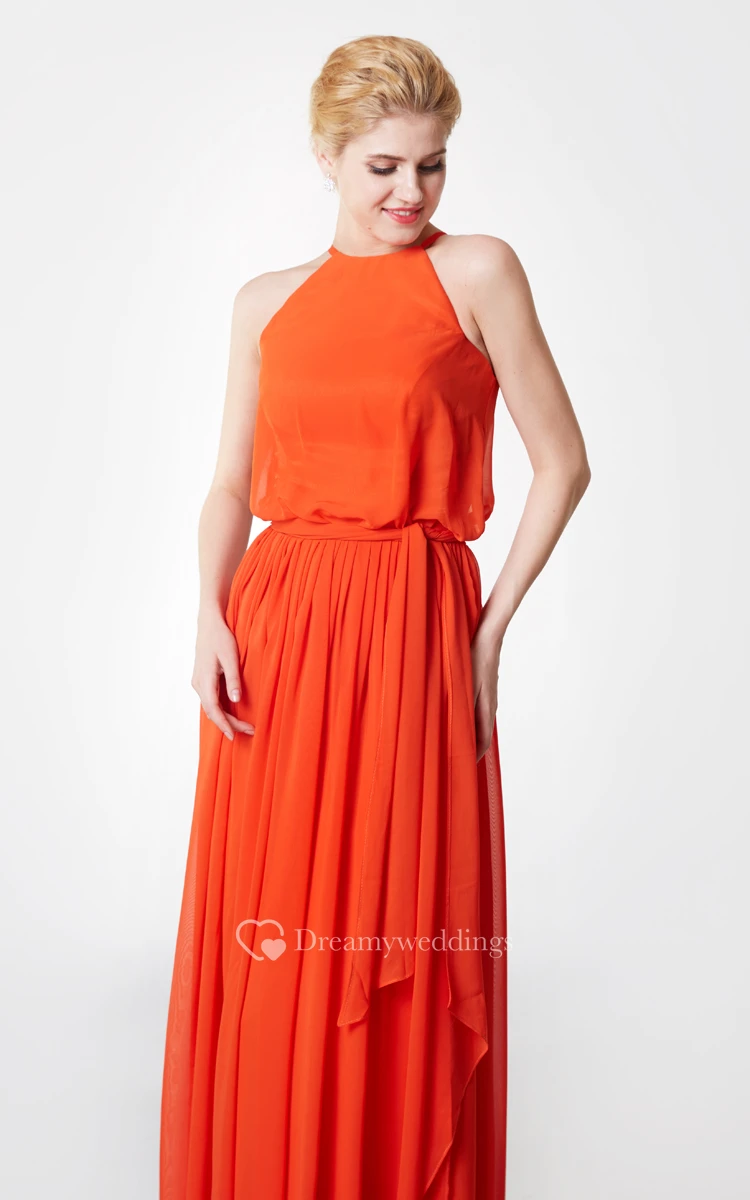 Sleeveless Pleated High Neck Chiffon Dress With Sash