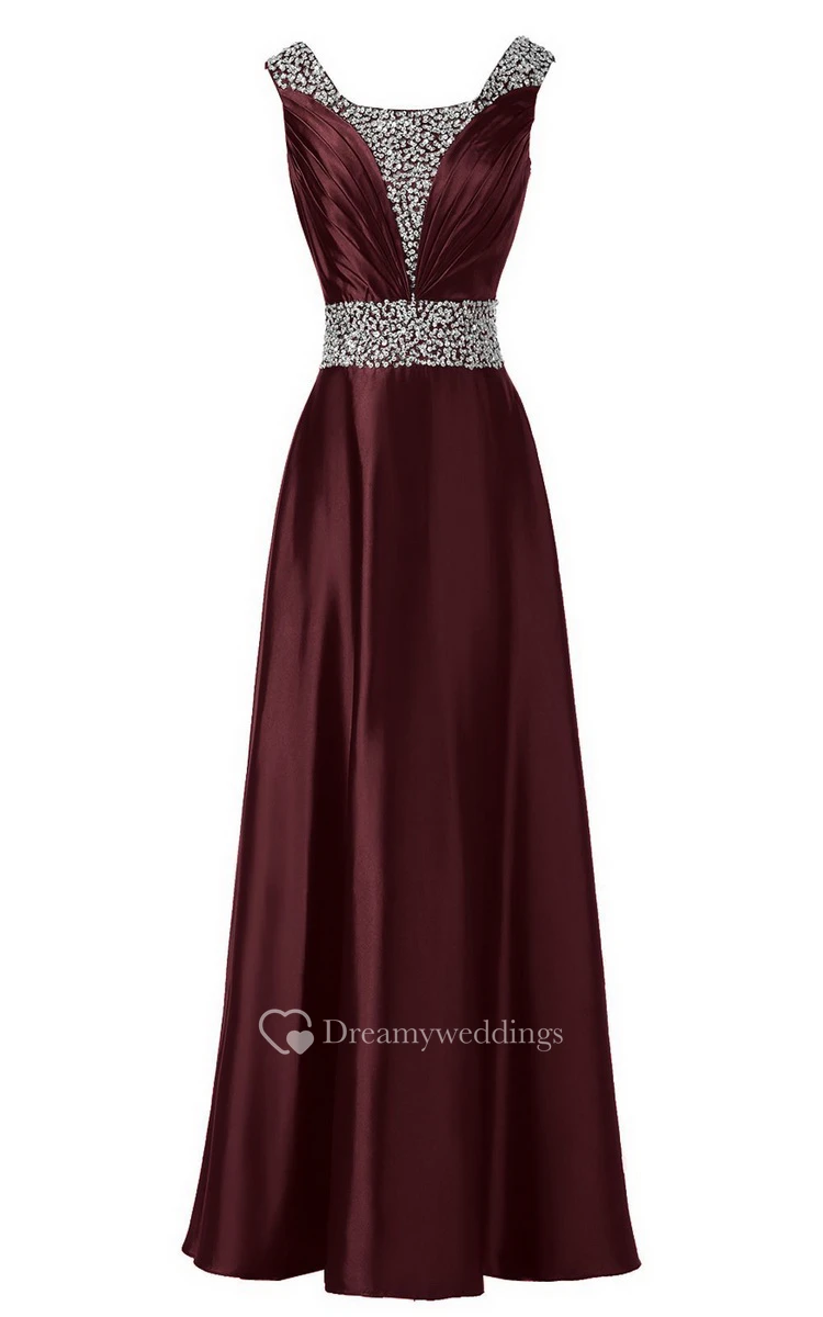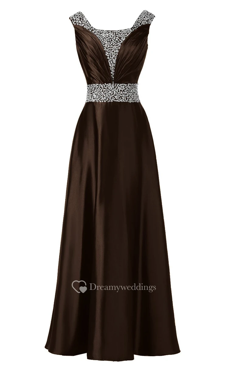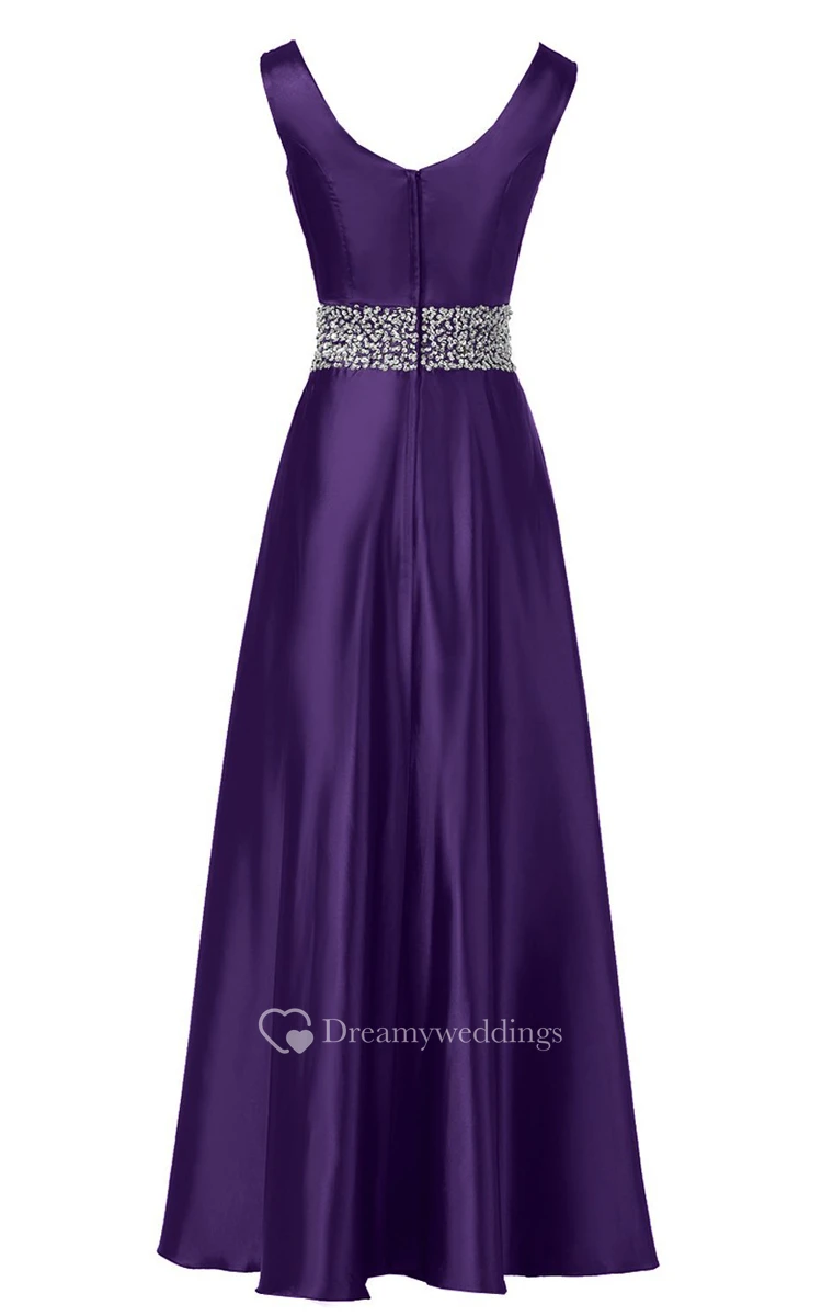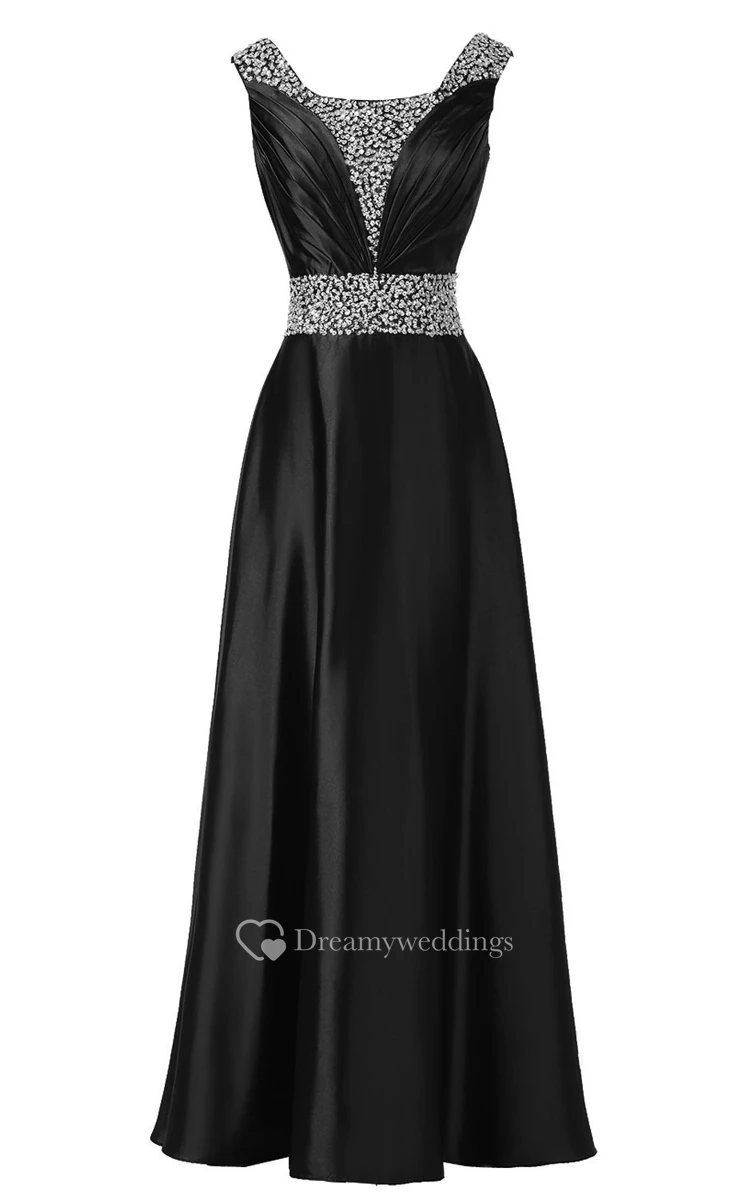 Sleeveless Pleated Satin Dress With Beading Belt and Trim