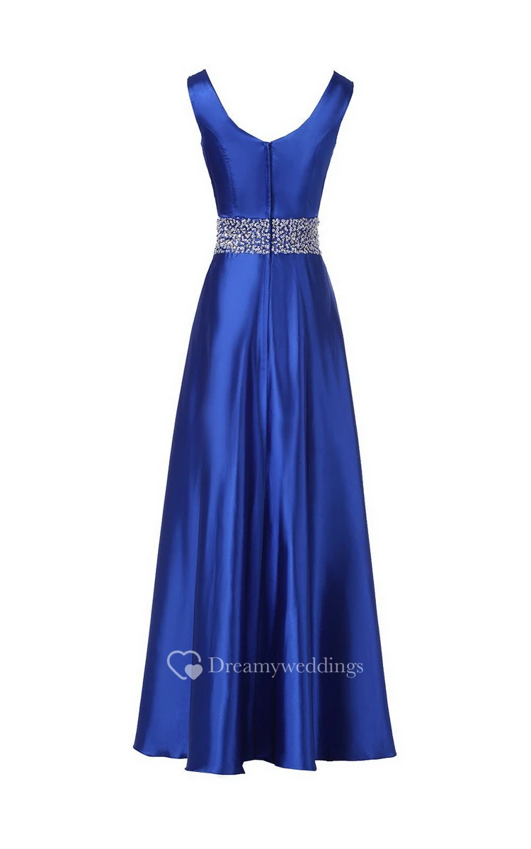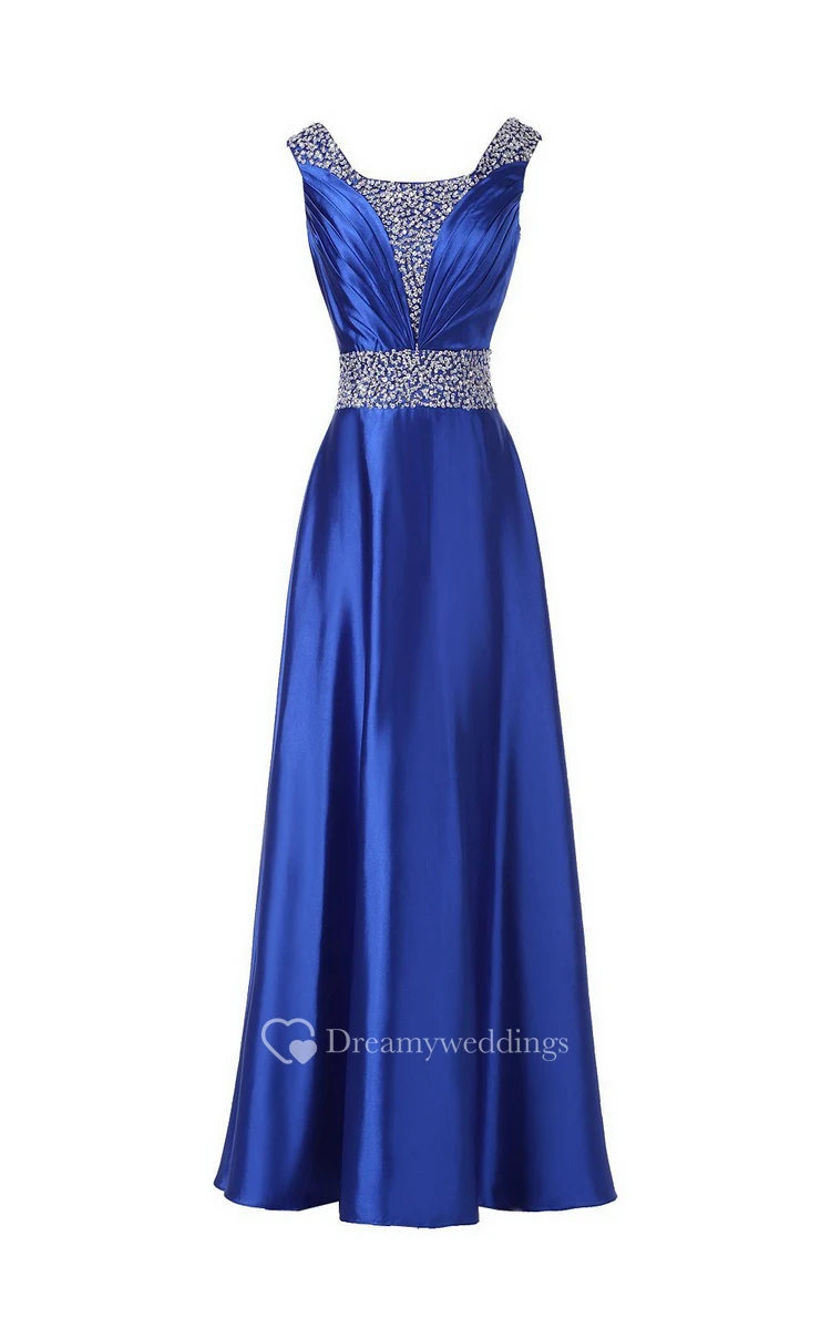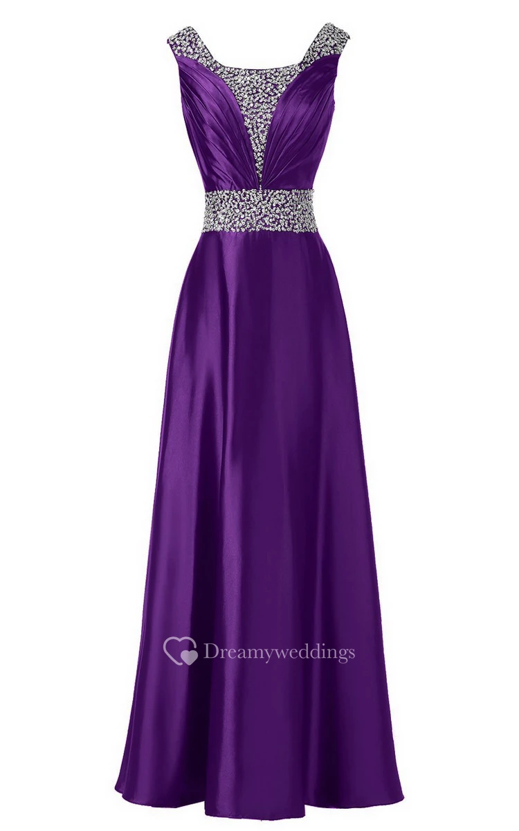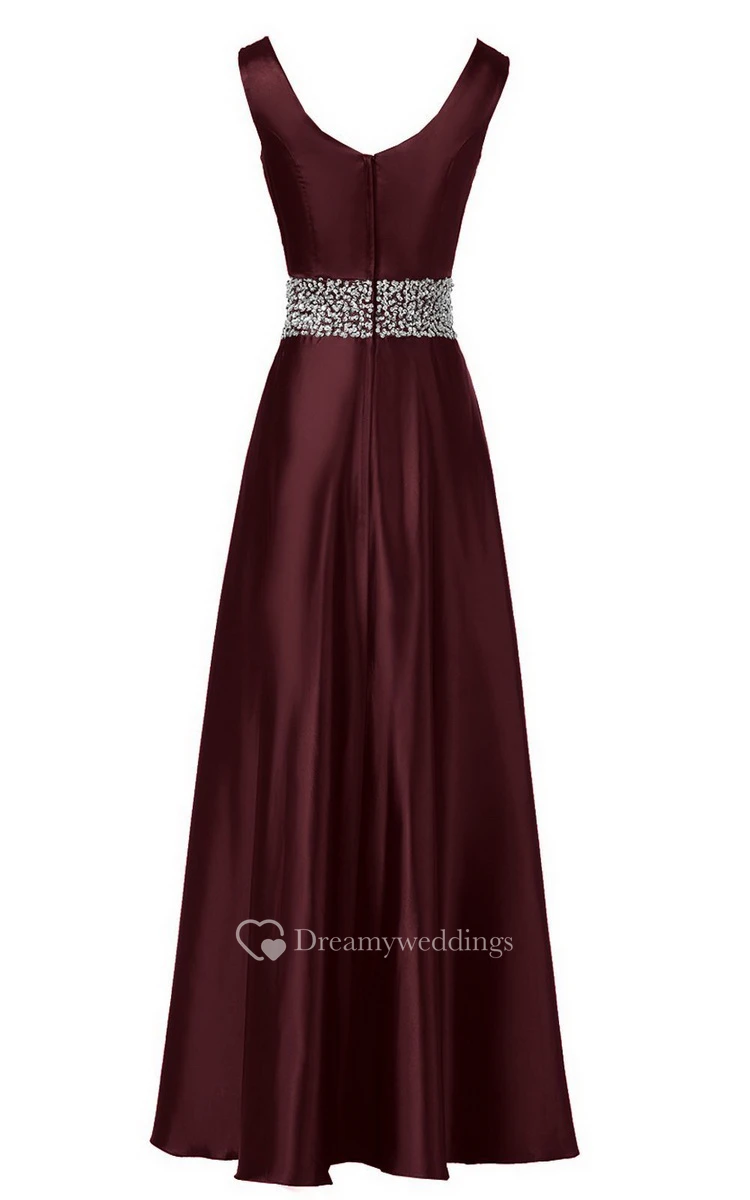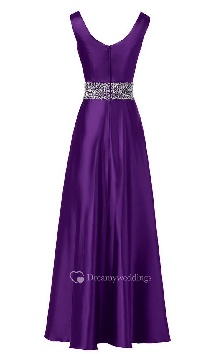 Sleeveless Pleated Satin Dress With Beading Belt and Trim