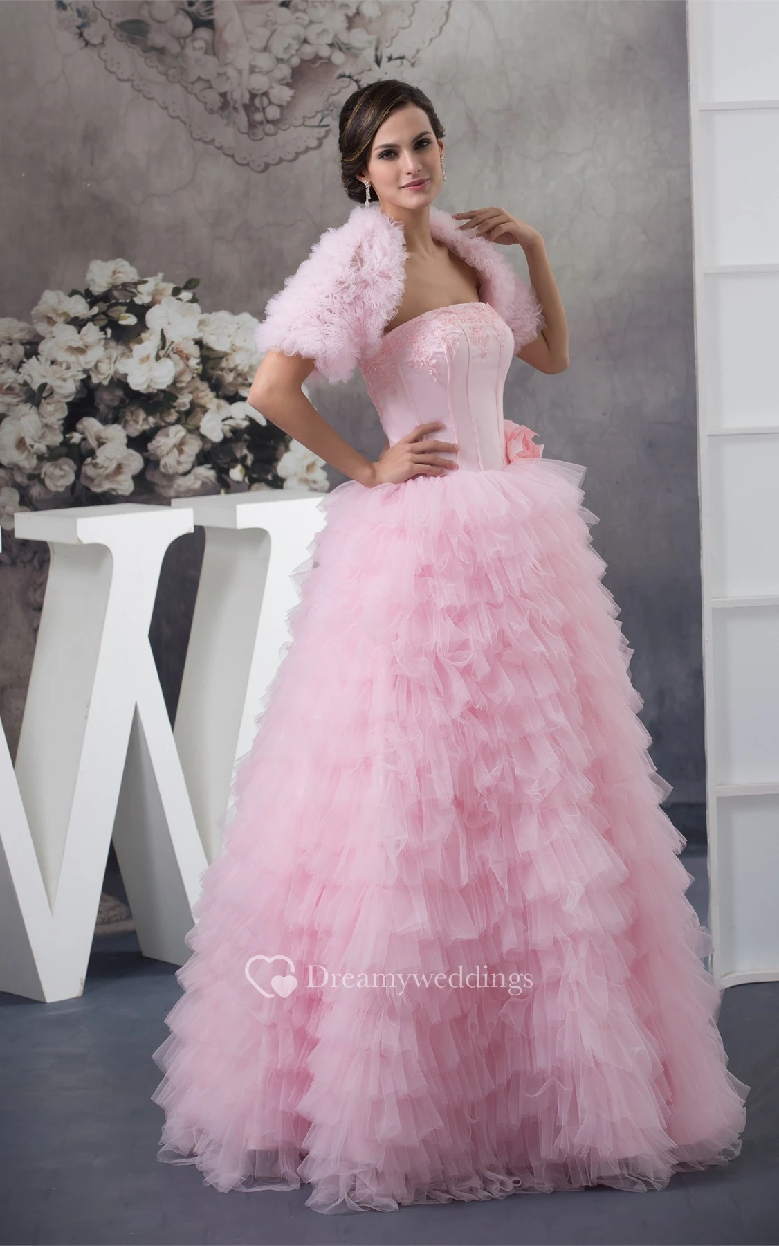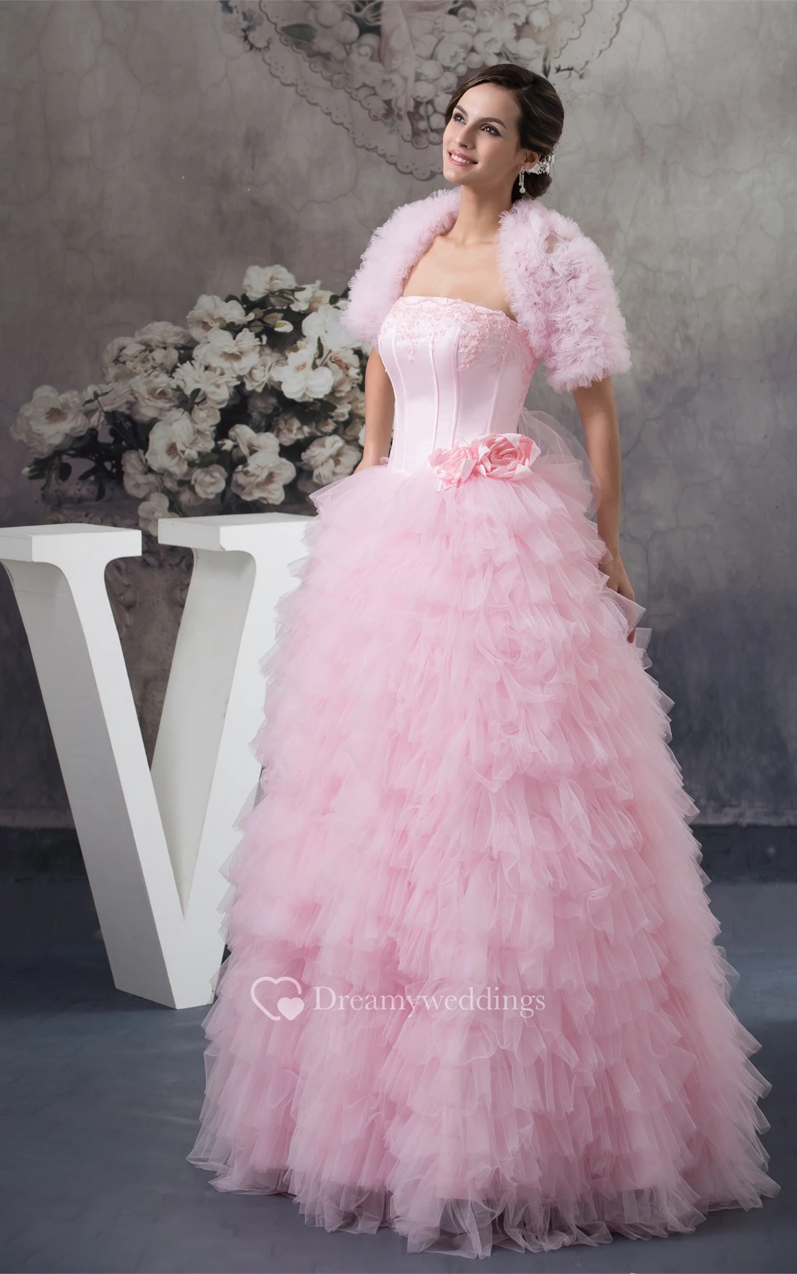 Sleeveless Ruffled Bolero and Ball-Gown With Appliques