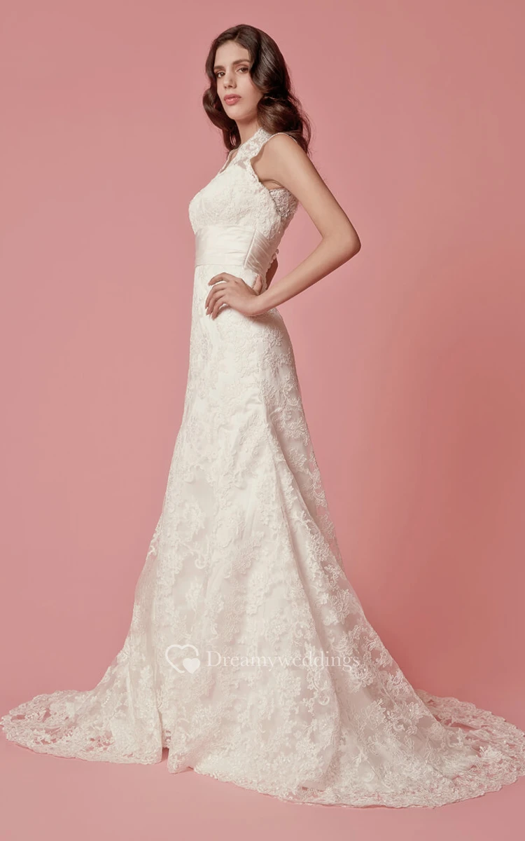 Sleeveless Scalloped Neck Long Lace Dress With Satin Belt