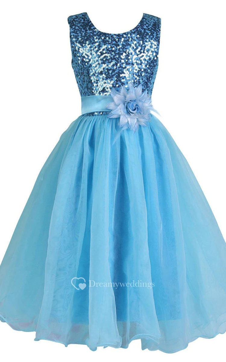 Sleeveless Scoop-neck Sequined Dress With Flower and Pleats