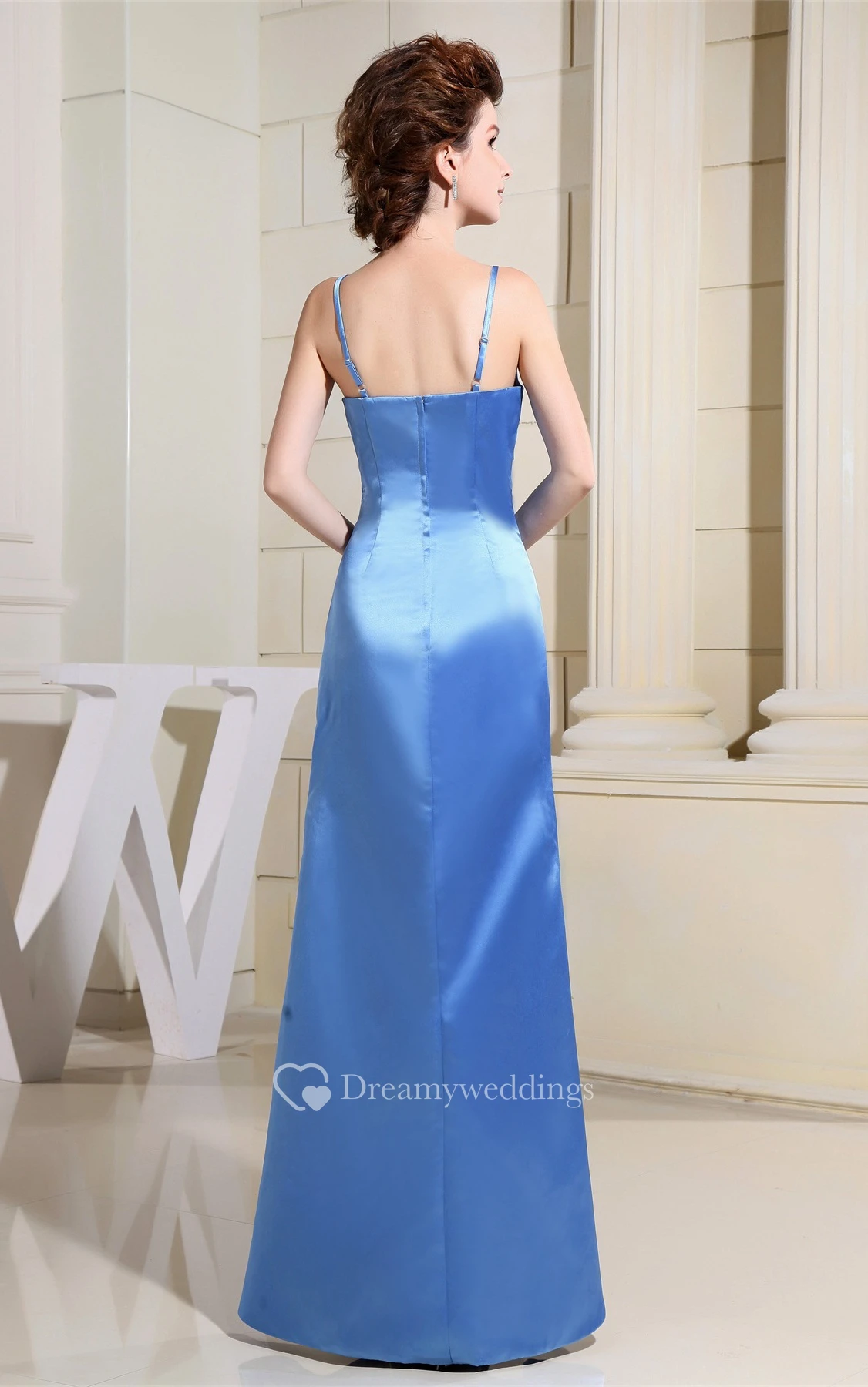 Sleeveless Spaghetti Straps Satin Sheath Gown With Jeweled Sash and Zipper Back