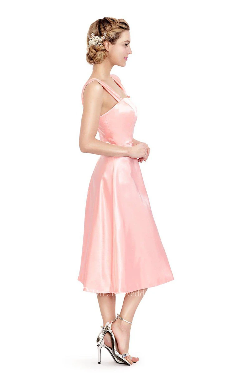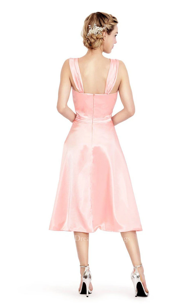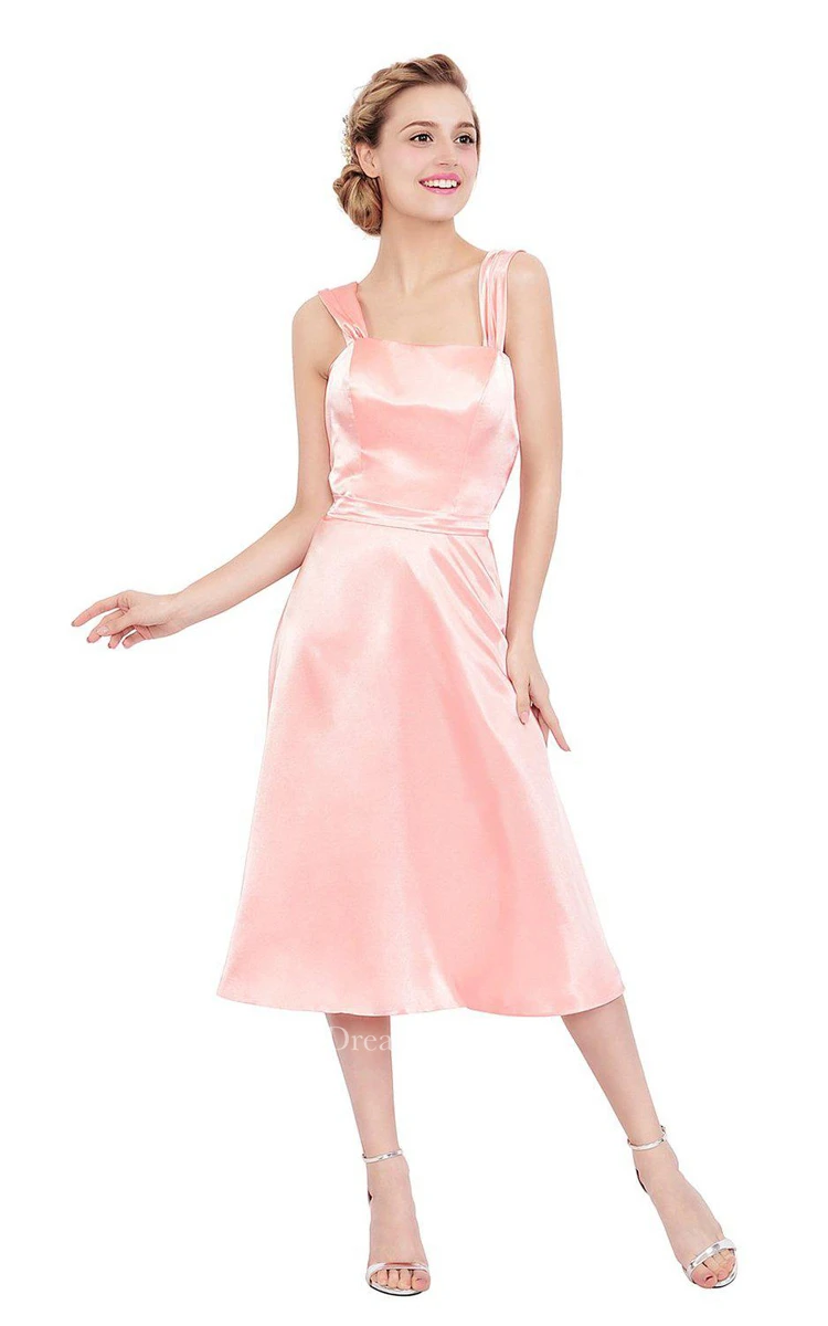 Sleeveless Tea-length Satin Dress With Square Neckline