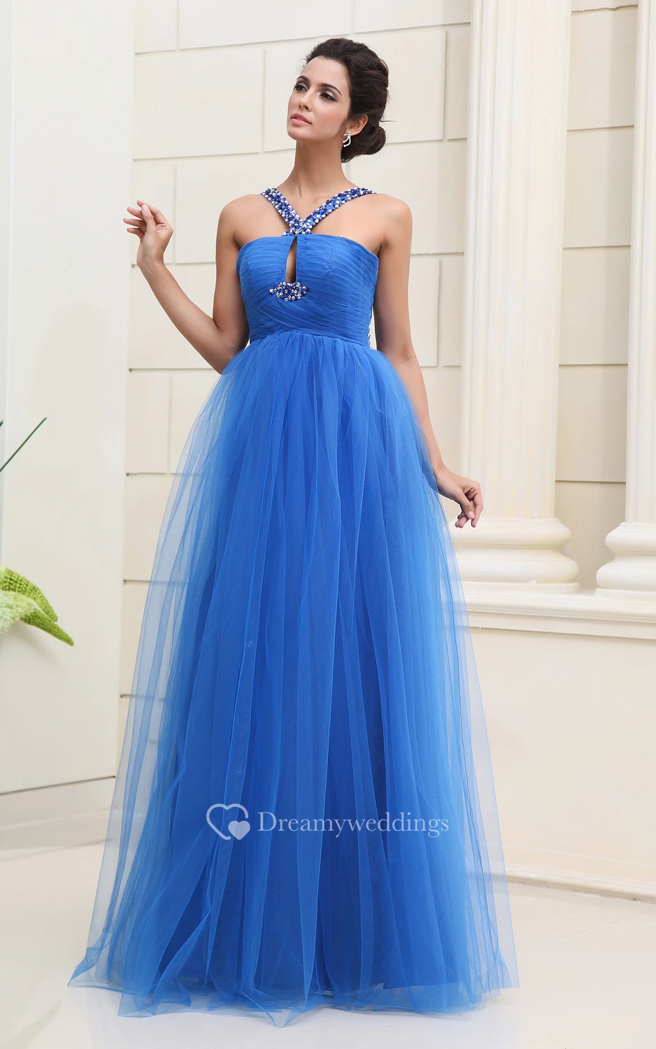 Sleeveless Tulle A-Line Long Dress With Beaded Straps