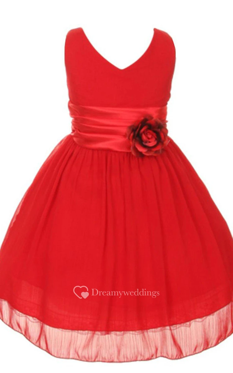 Sleeveless V-neck A-line Pleated Dress With Flower