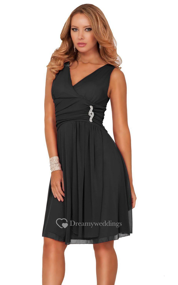 Sleeveless V-neck Knee-length Dress With Brooch