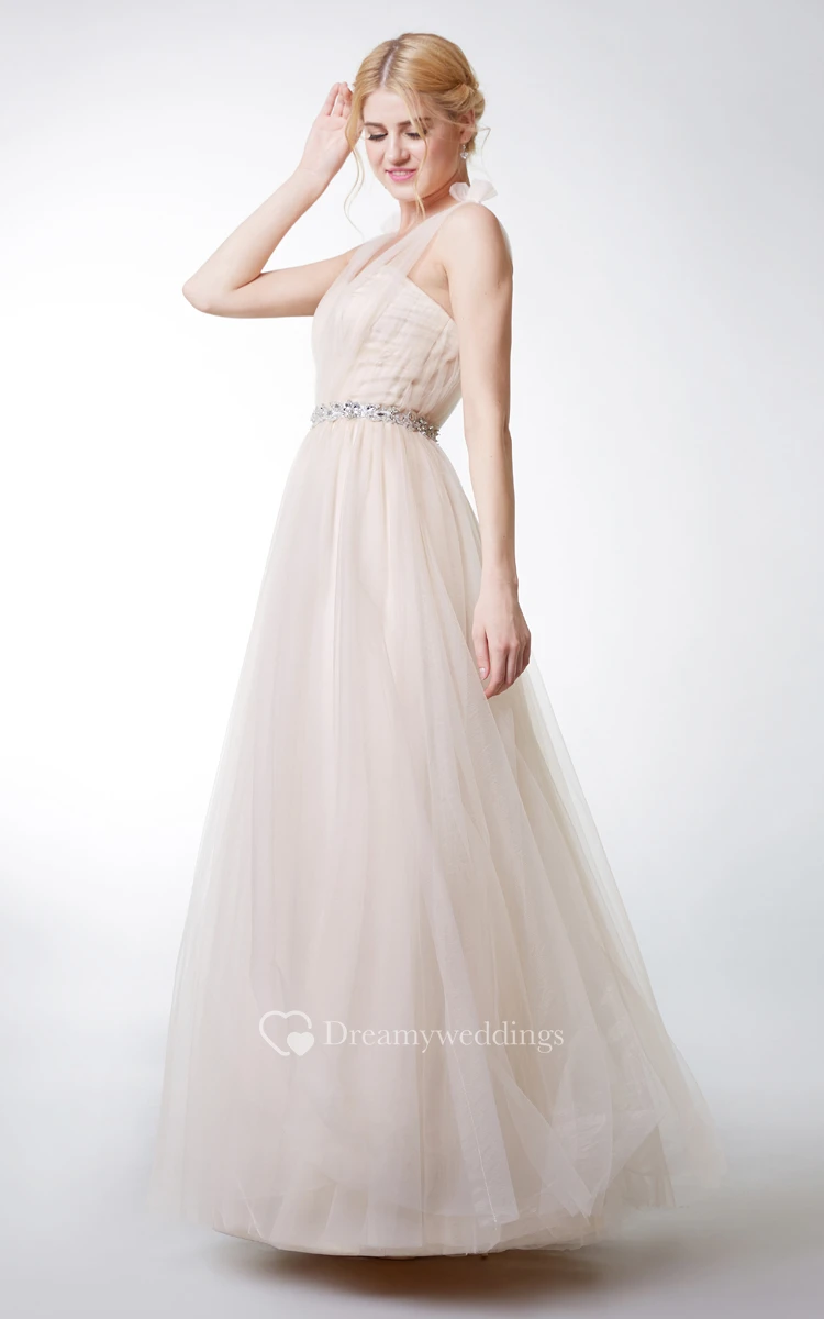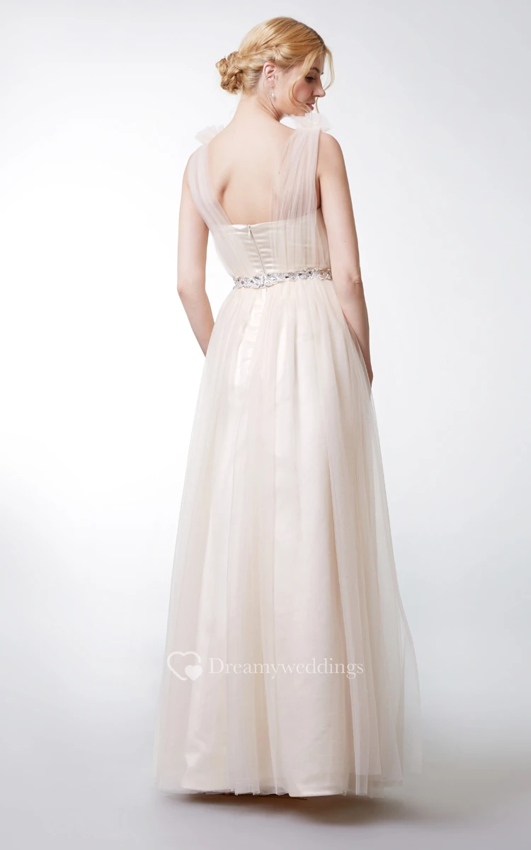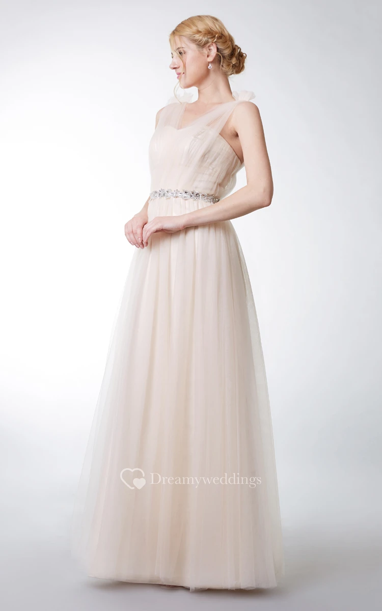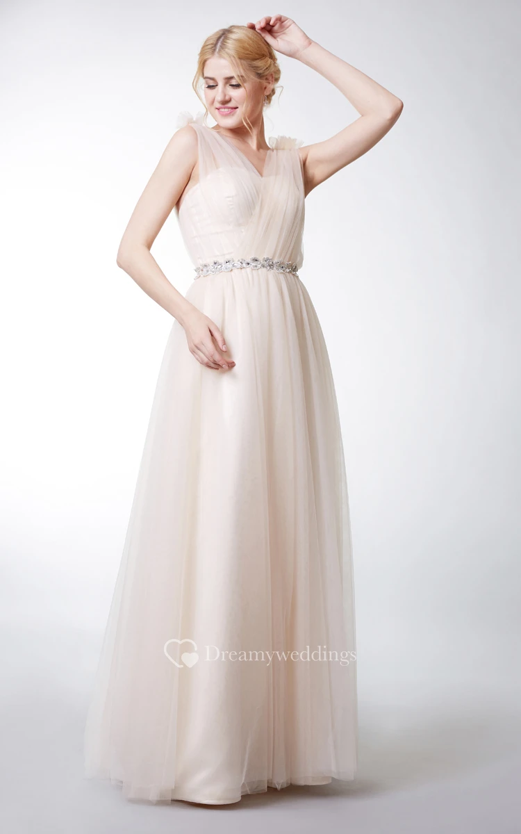 Sleeveless V Neck Pleated Long Tulle Dress With Applique Belt