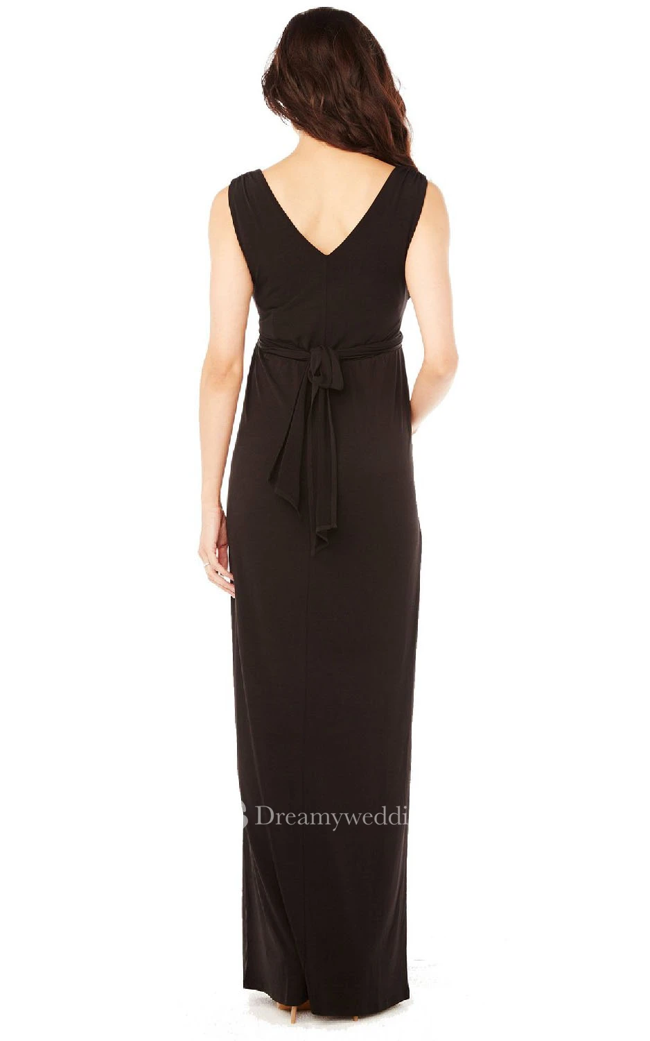 Sleeveless V-neck Ruched Bodice Long Satin Dress