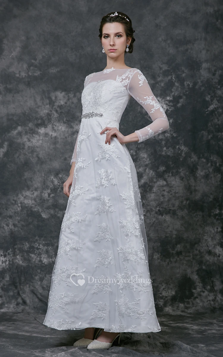 Sophisticated Full Sleeve Bateau Neck A-line Lace Gown With Beaded Belt