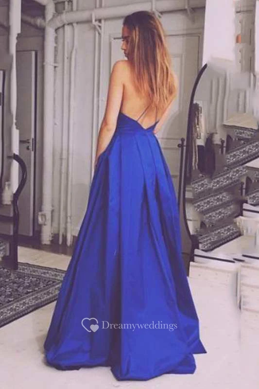 Spaghetti Strap Low V Neck A-line Pleated Long Satin Dress