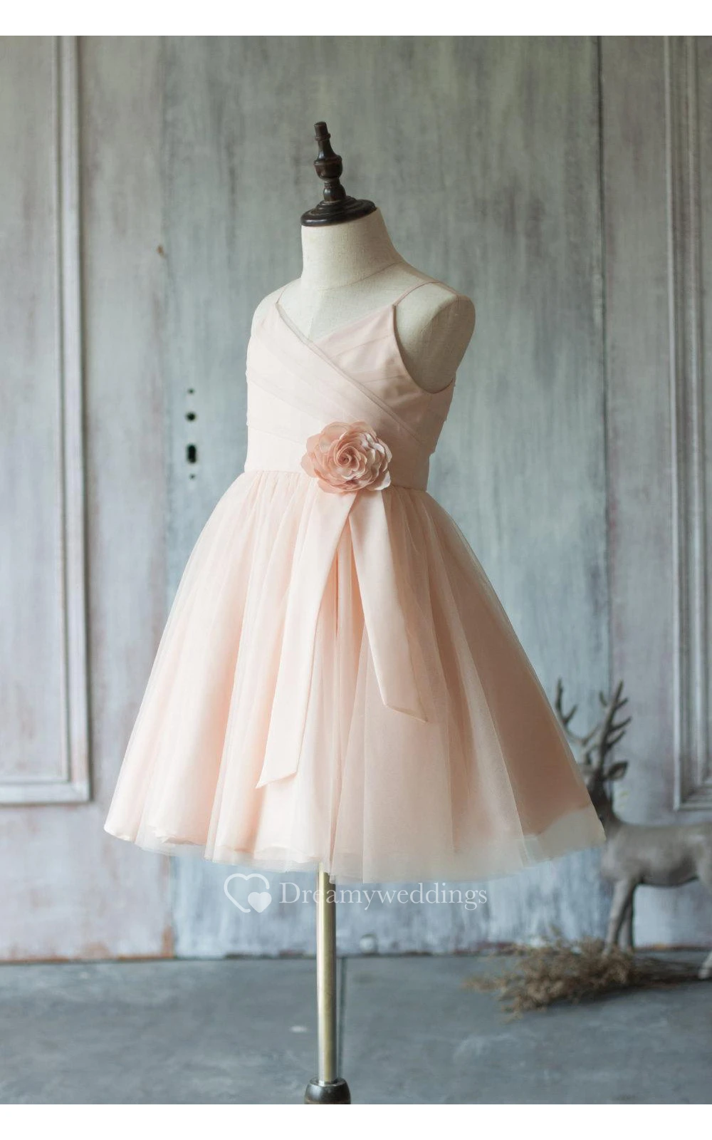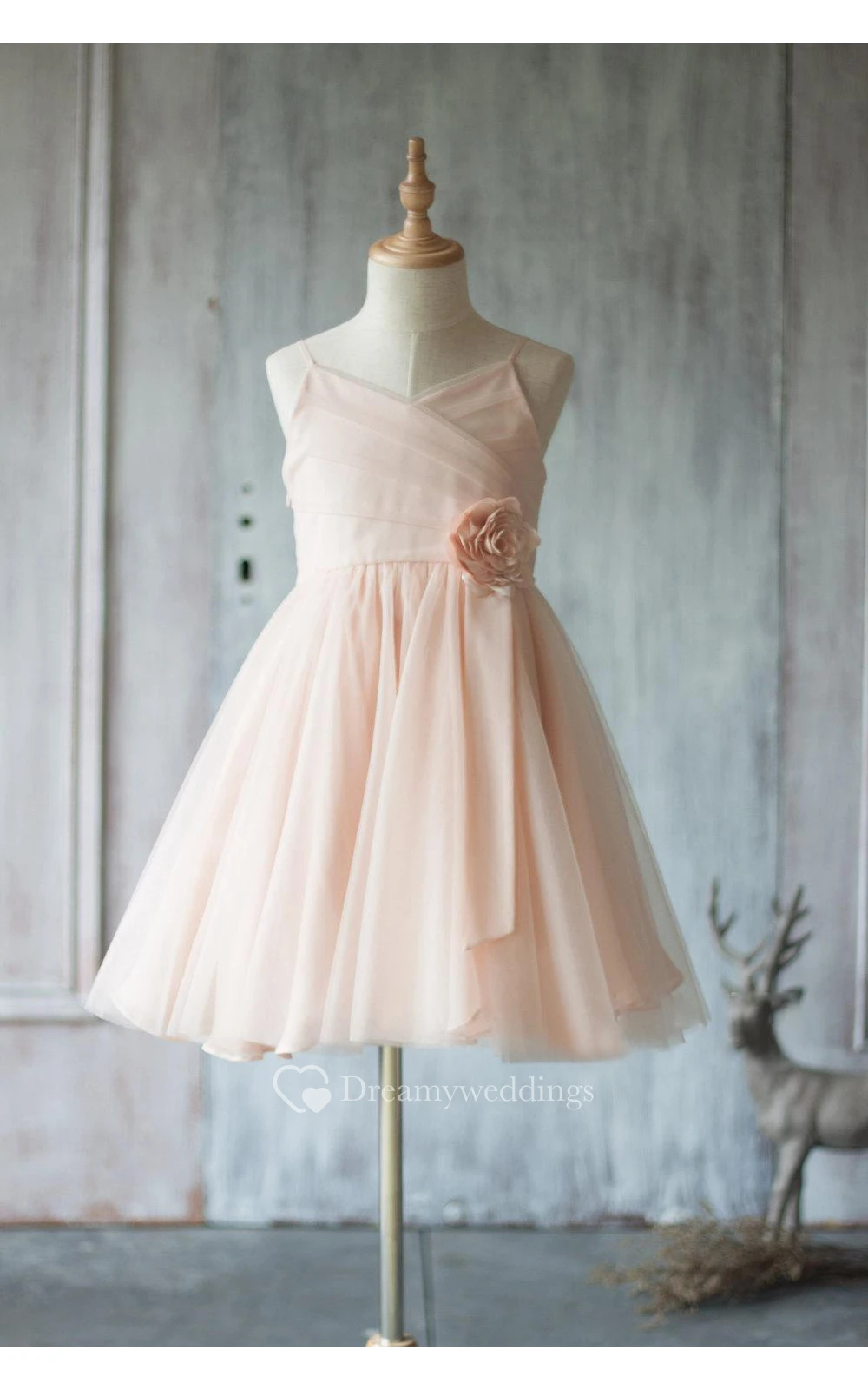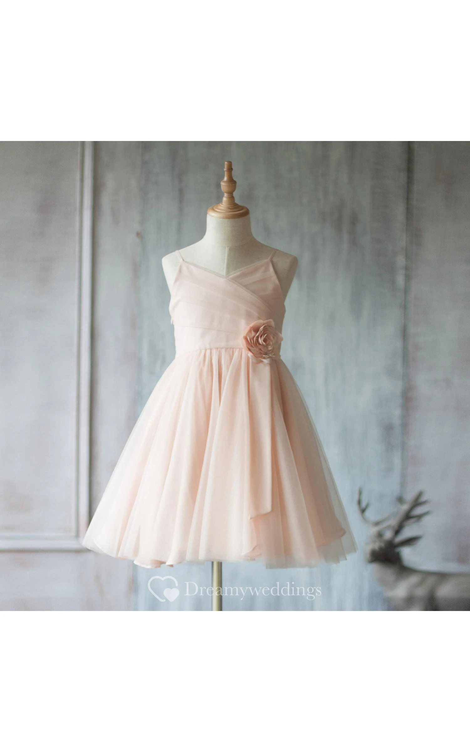 Spaghetti Straps V Neck A-line Pleated Tulle Short Dress With Flower
