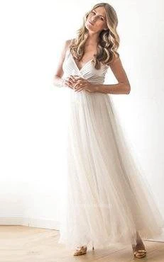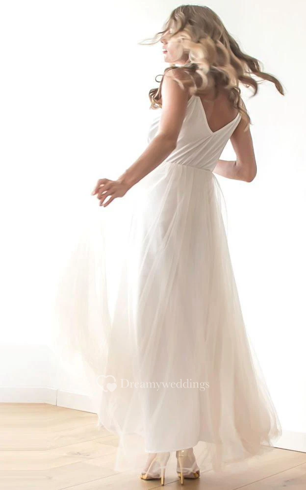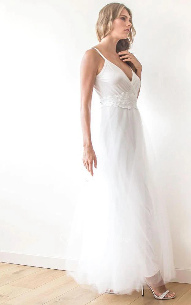 Spaghetti Straps V Neck A-line Tulle Ankle Length Dress With Sash