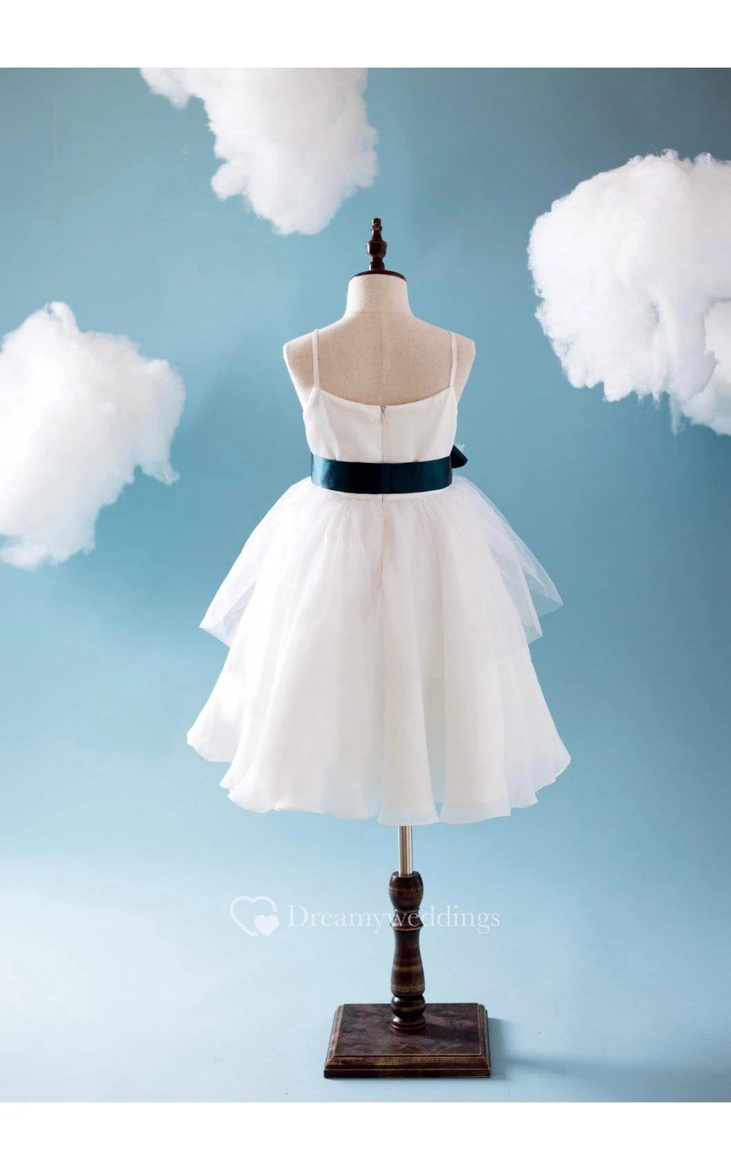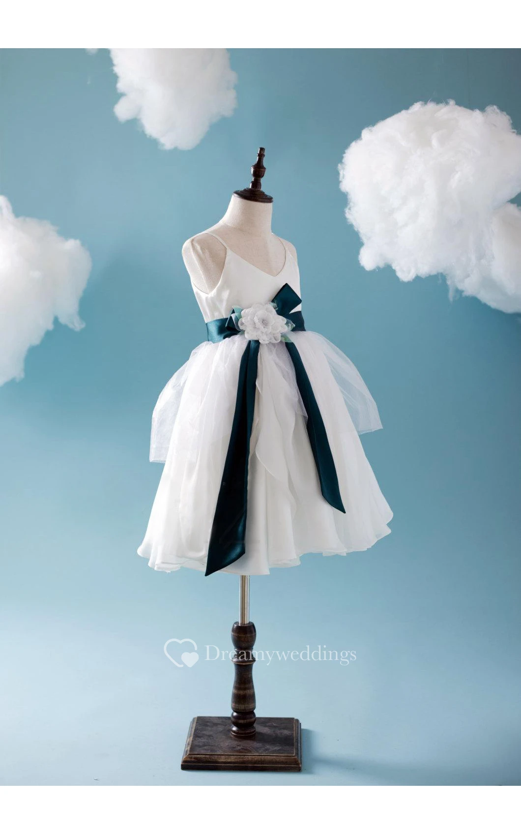 Spaghetti Straps V-neck Layered Organza A-line Long Dress With Floral Sash
