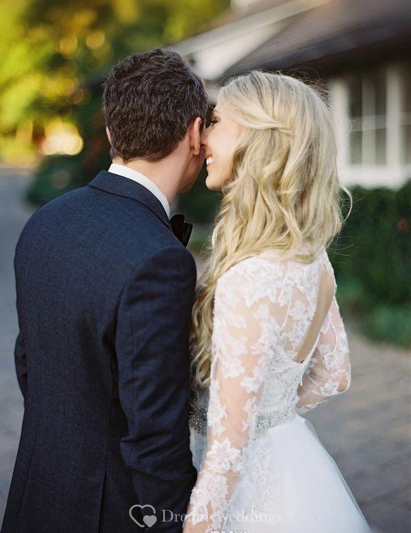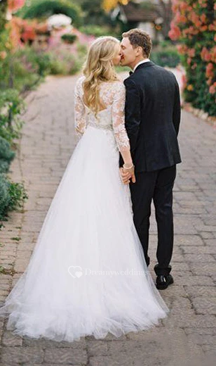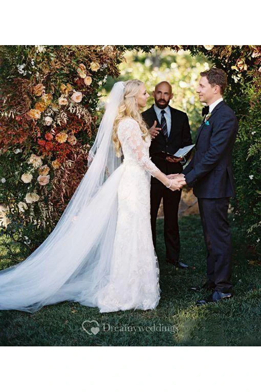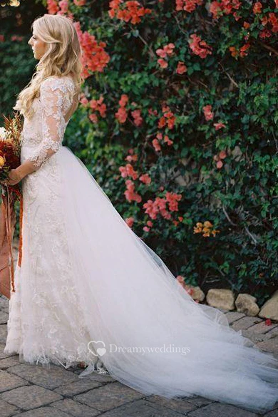 Spring Long Sleeves Keyhole Back Lace Wedding Dress with Detachable Skirt