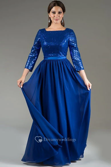 Square Neck 3-4 Sleeve Sequin Top Chiffon Long Mother Of The Bride Dress With Satin Sash