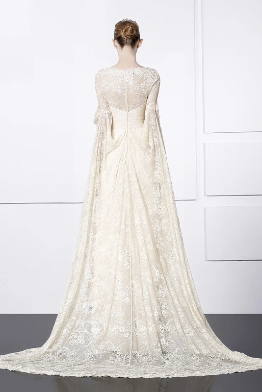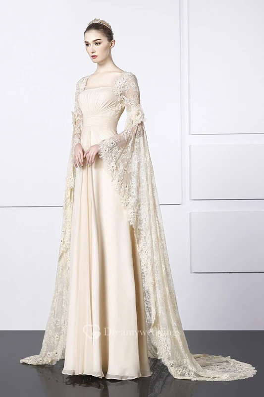 Square Sheath Bat Sleeve Lace Chiffon Unique Gown With Train