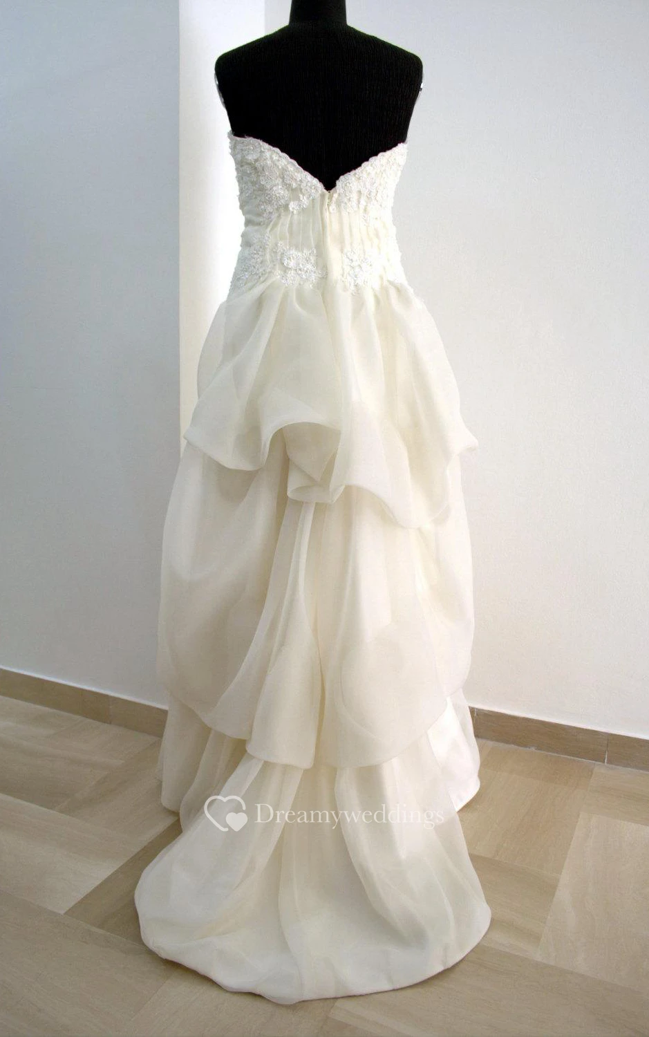 Strapless A-Line Organza Dress With Lace Appliques and Ruffles