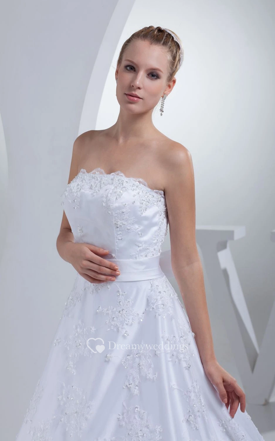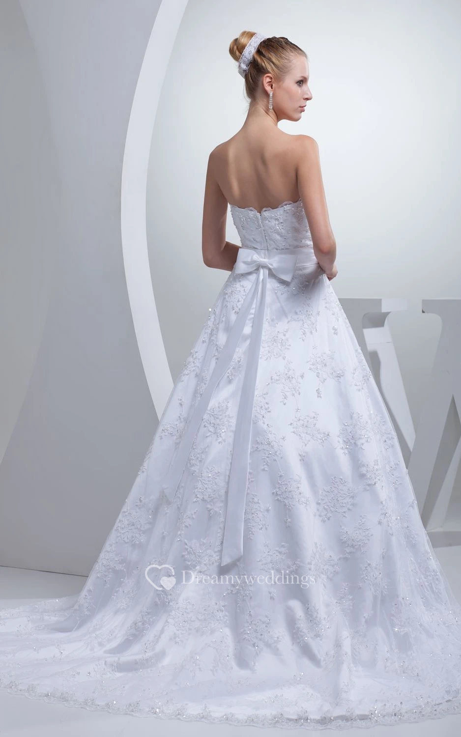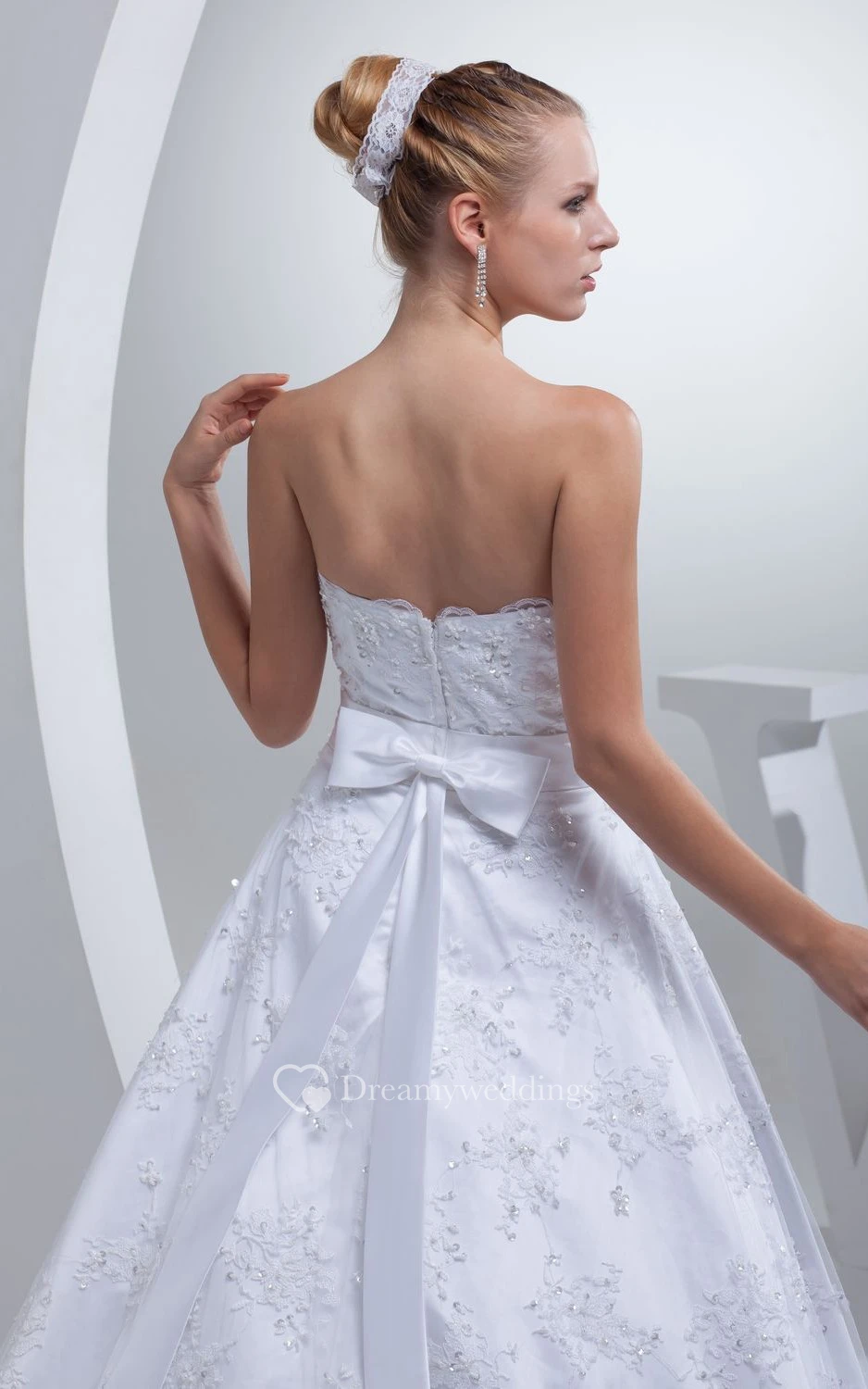 Strapless Appliqued A-Line Gown With Bow and Beading