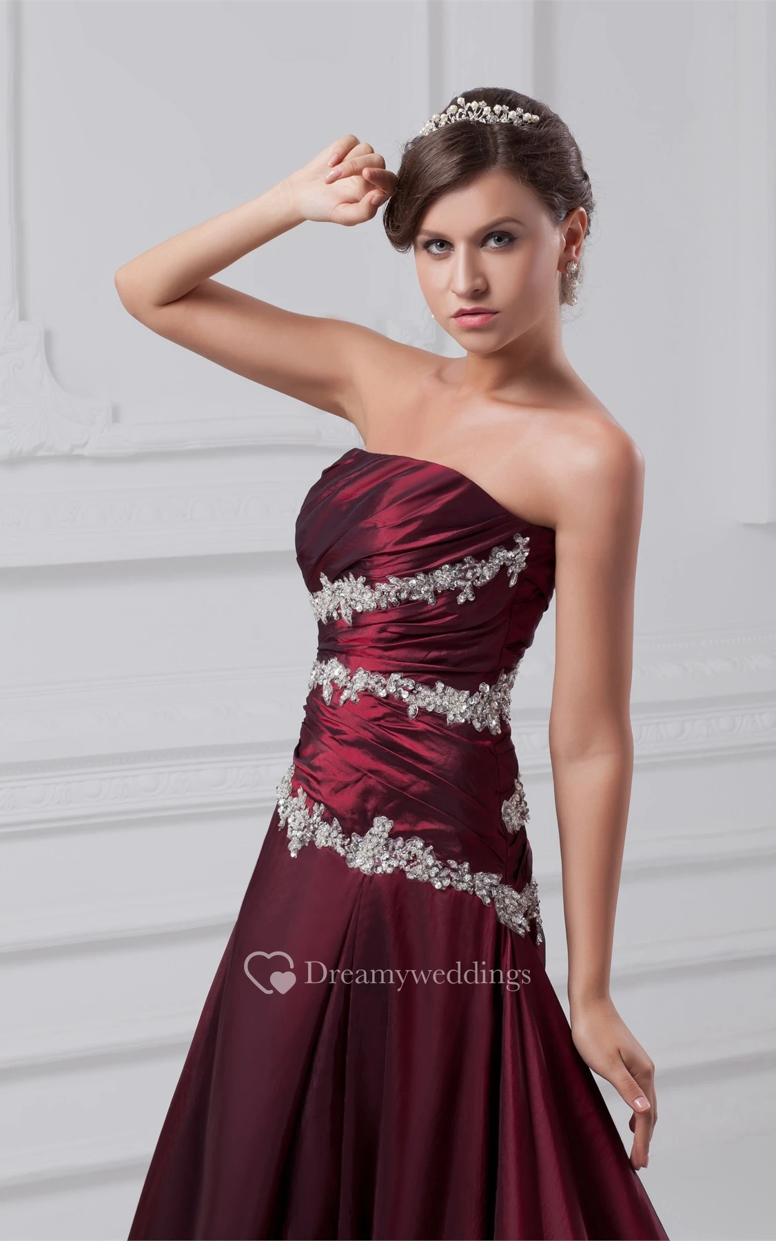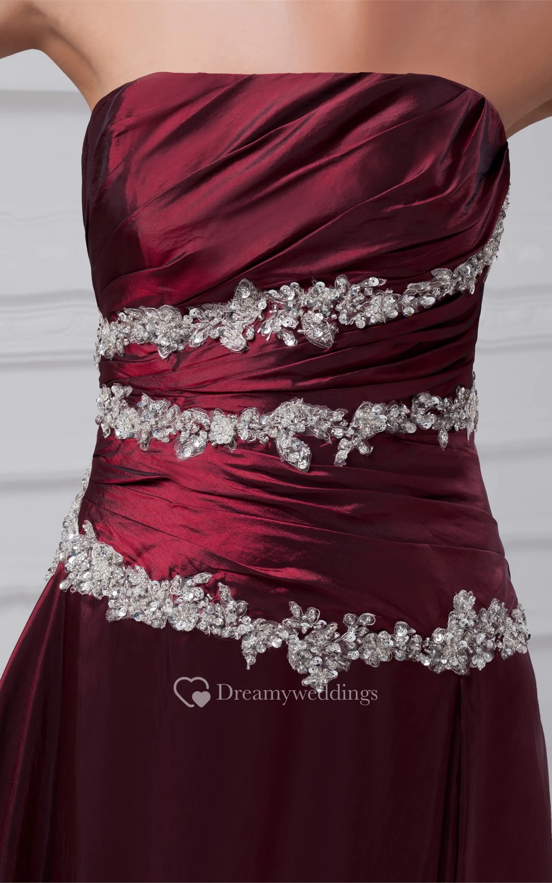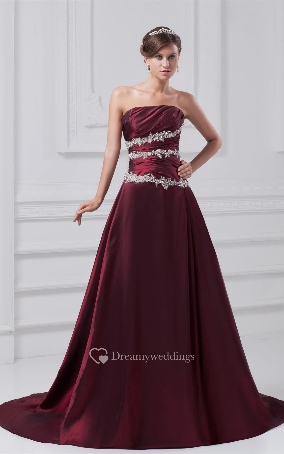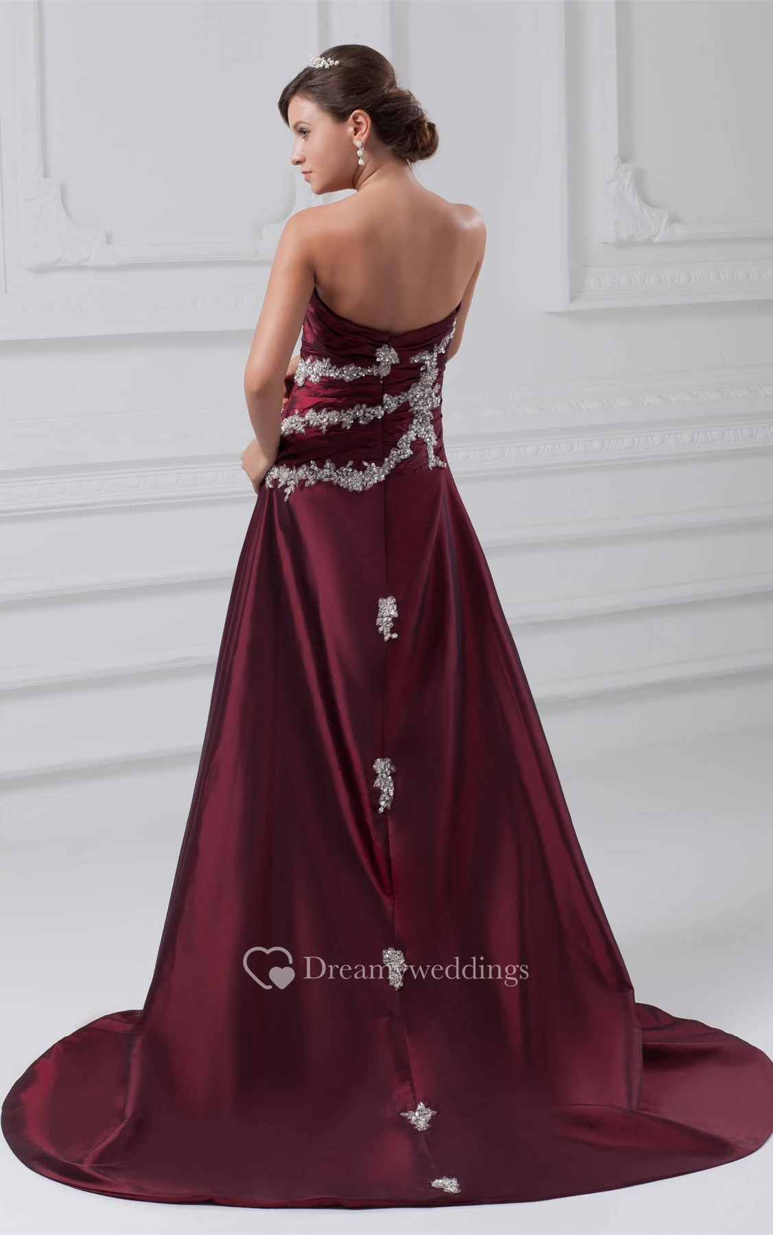 Strapless Appliqued A-Line Gown With Ruched Bodice